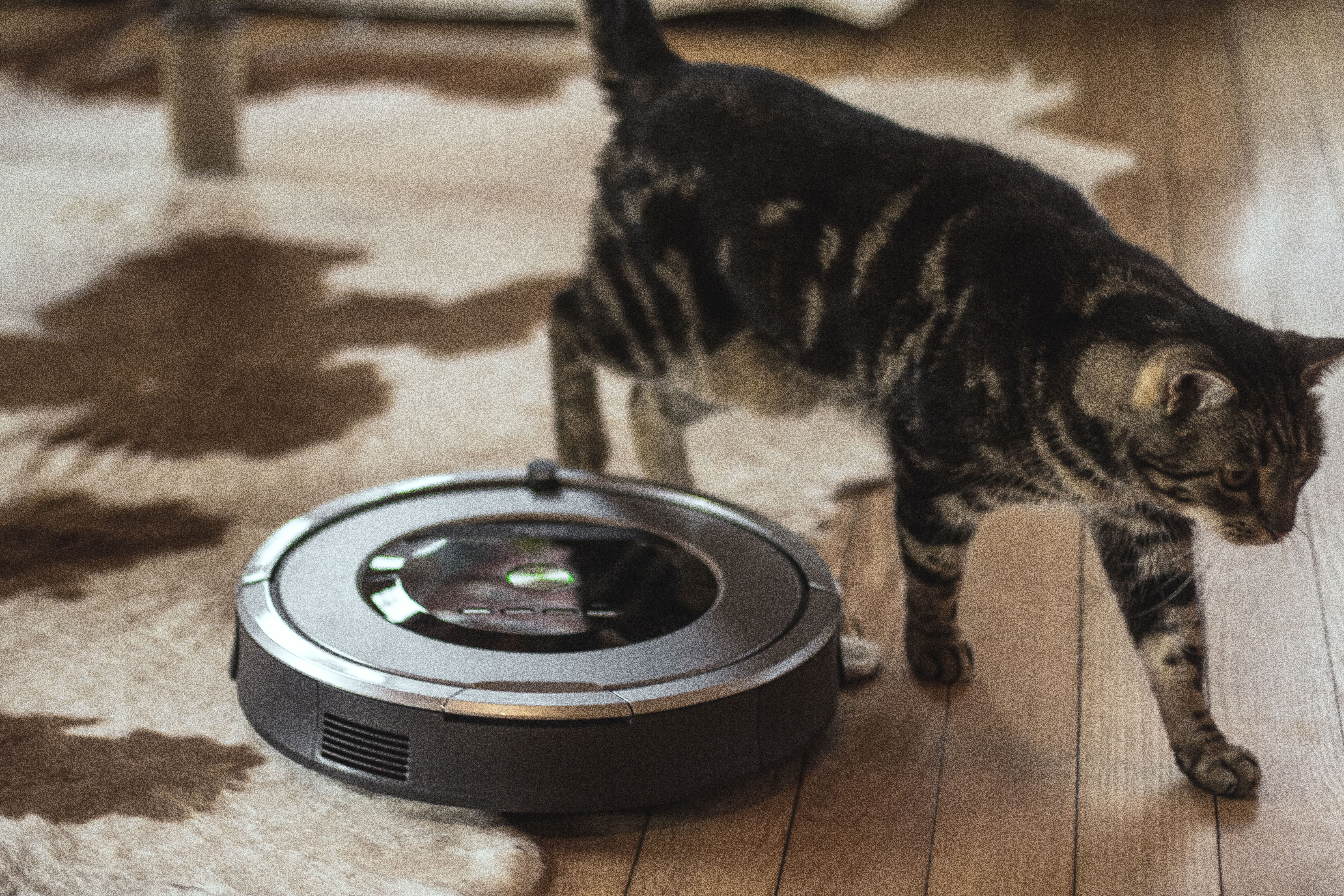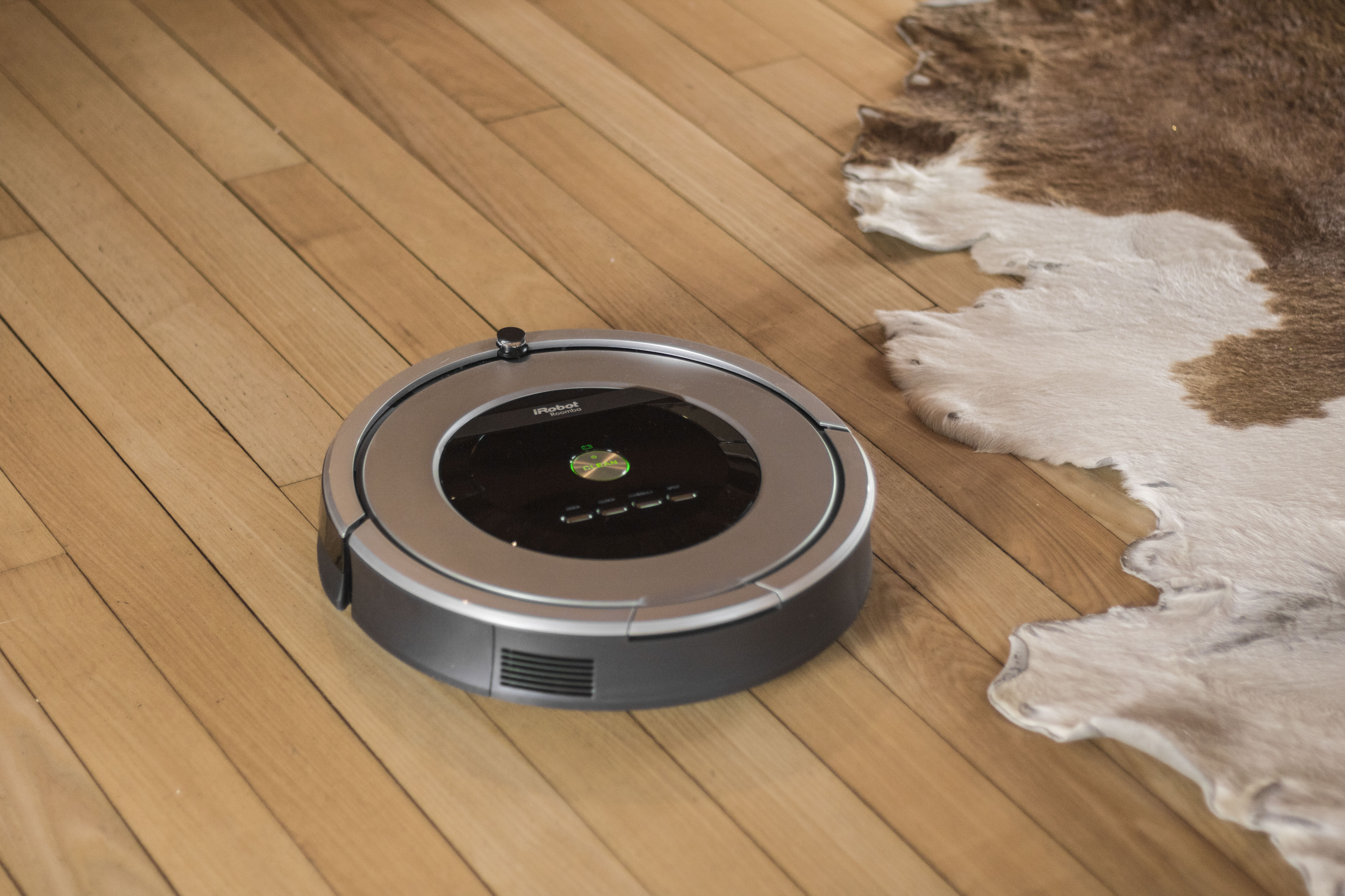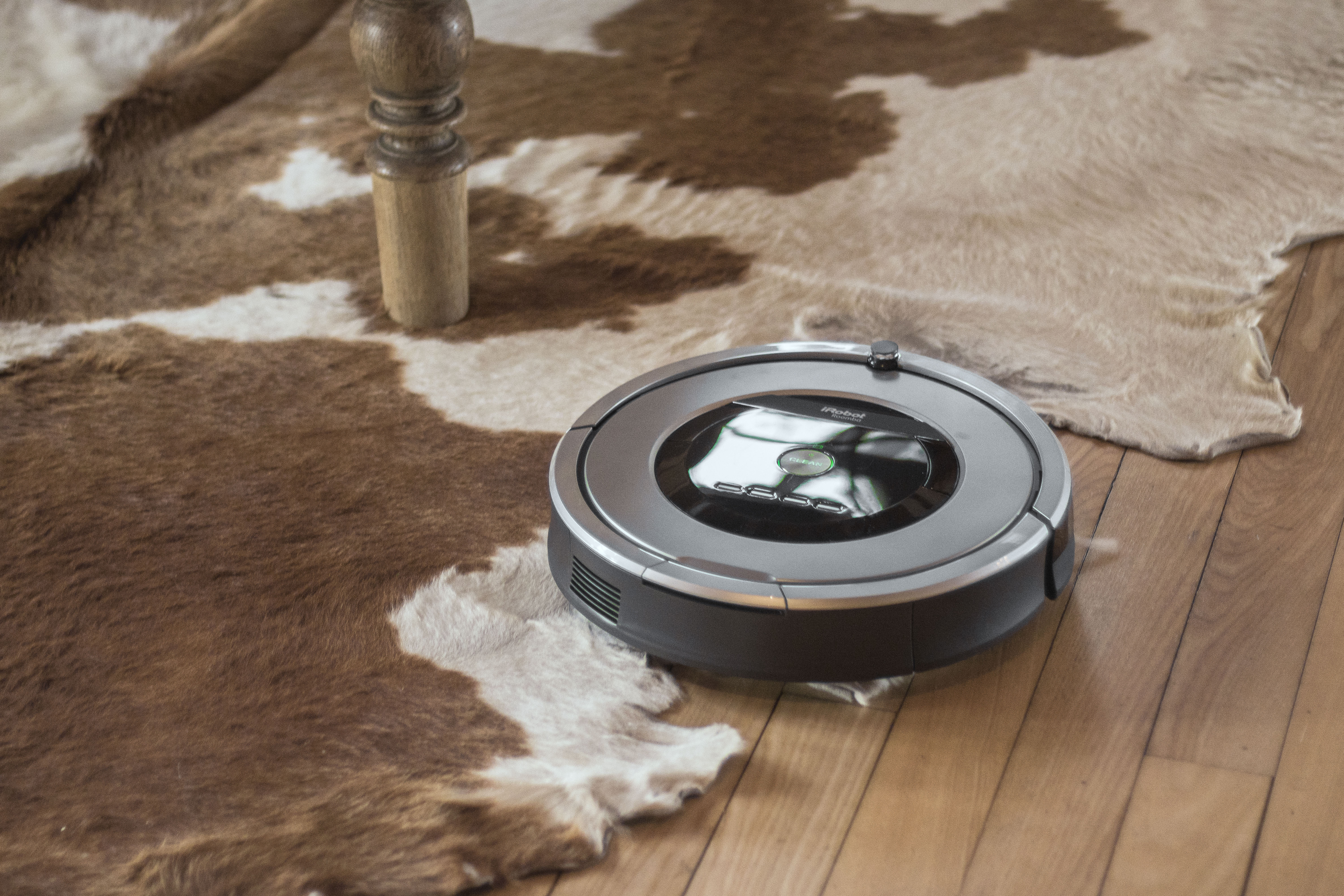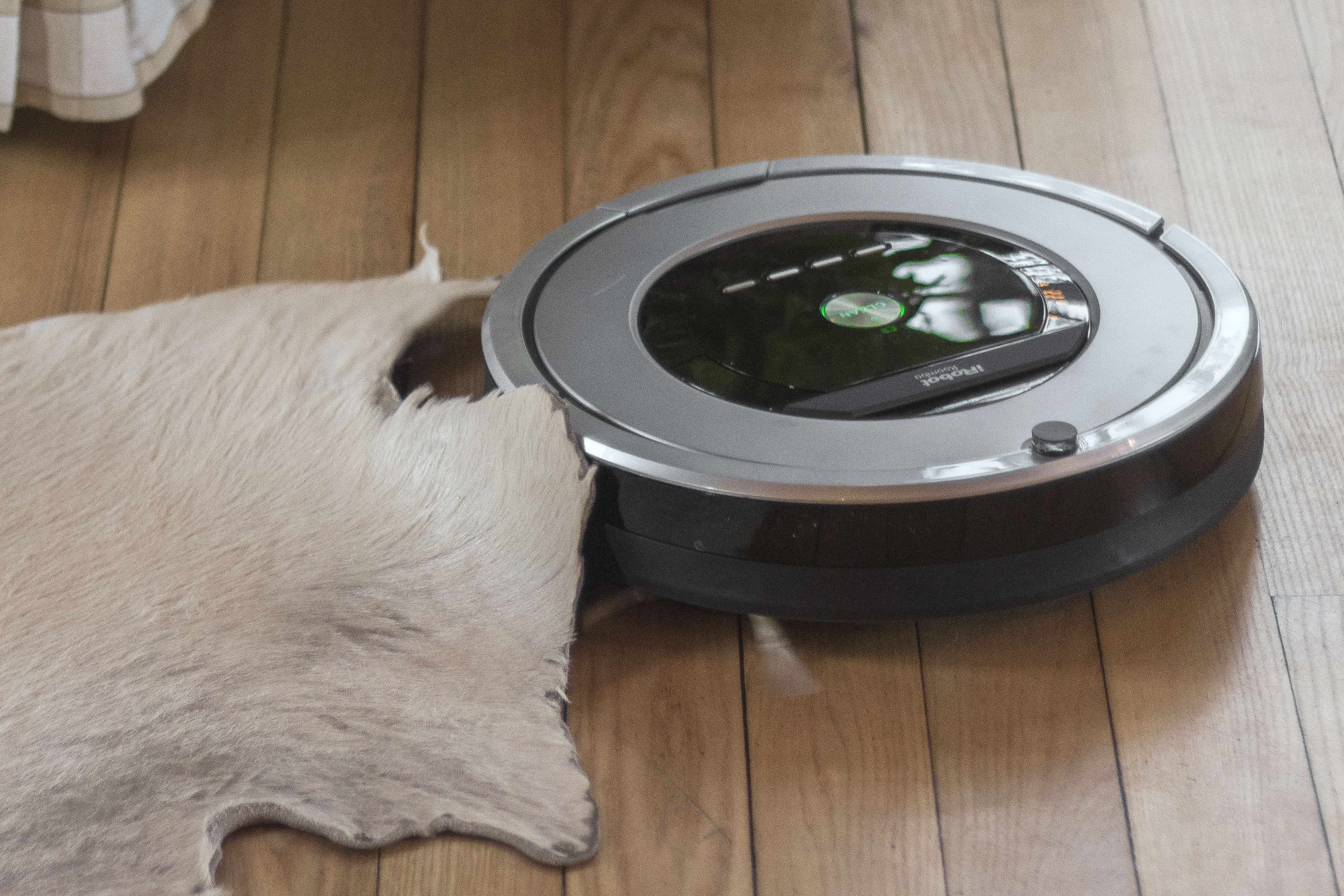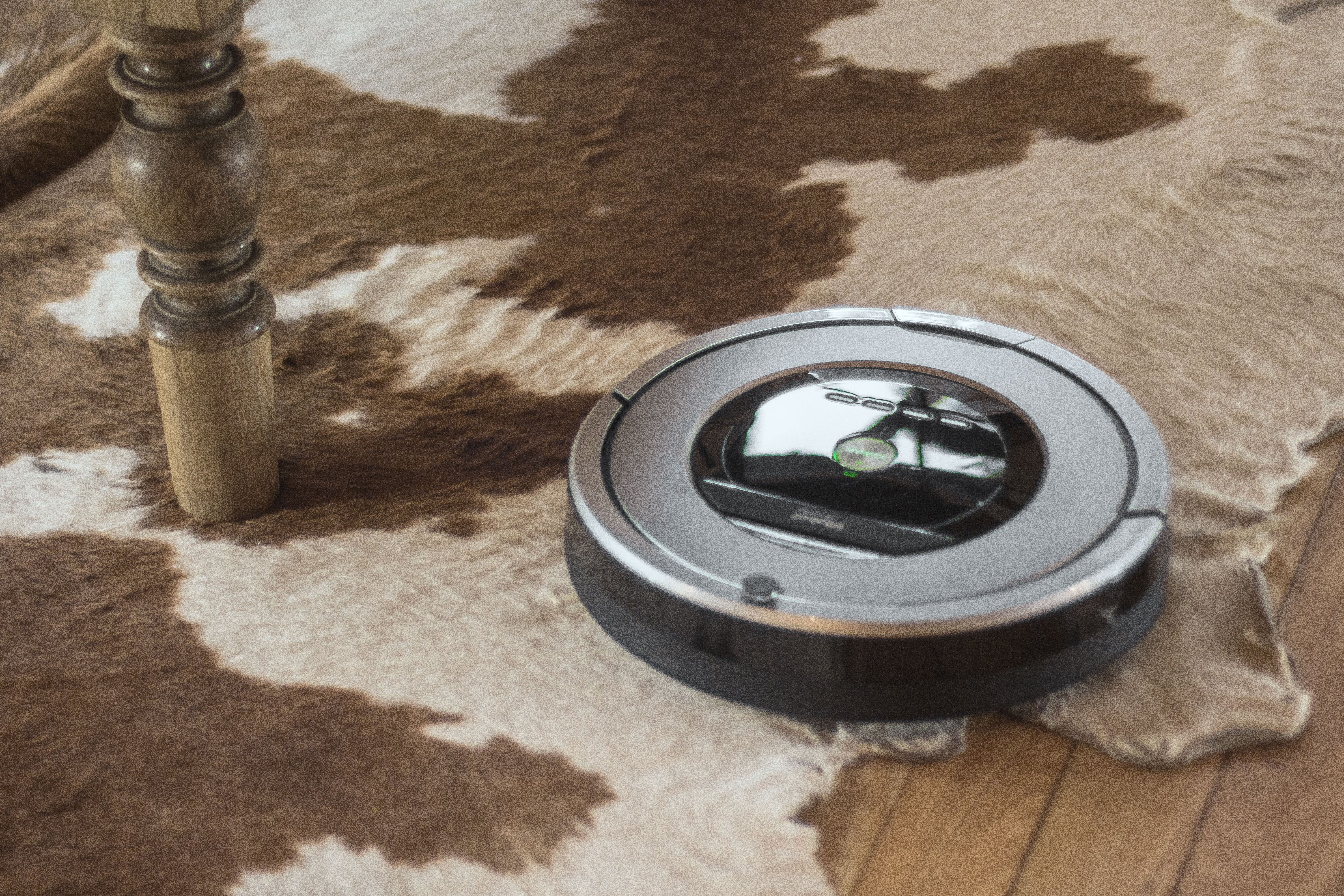 Przyszła zatem pora na obserwację: Roomba ruszyła od razu tam, gdzie ja nie byłam od dawna, czyli pod szafkę pod telewizorem. Spędziła tam sporo czasu, odkurzając przestrzenie między zamontowanymi na podłodze kablami. Potem pewnym ruchem ruszyła w kierunku skóry krowy, która leży na podłodze – i co ciekawe: mimo że skóra nie jest płaska, w paru miejscach odstaje i ma dość wysokie brzegi, Roomba zasuwała niezniechęcona i odkurzyła futro bardzo dokładnie (wiem, bo na próbę wysypałam jej tam brokat).