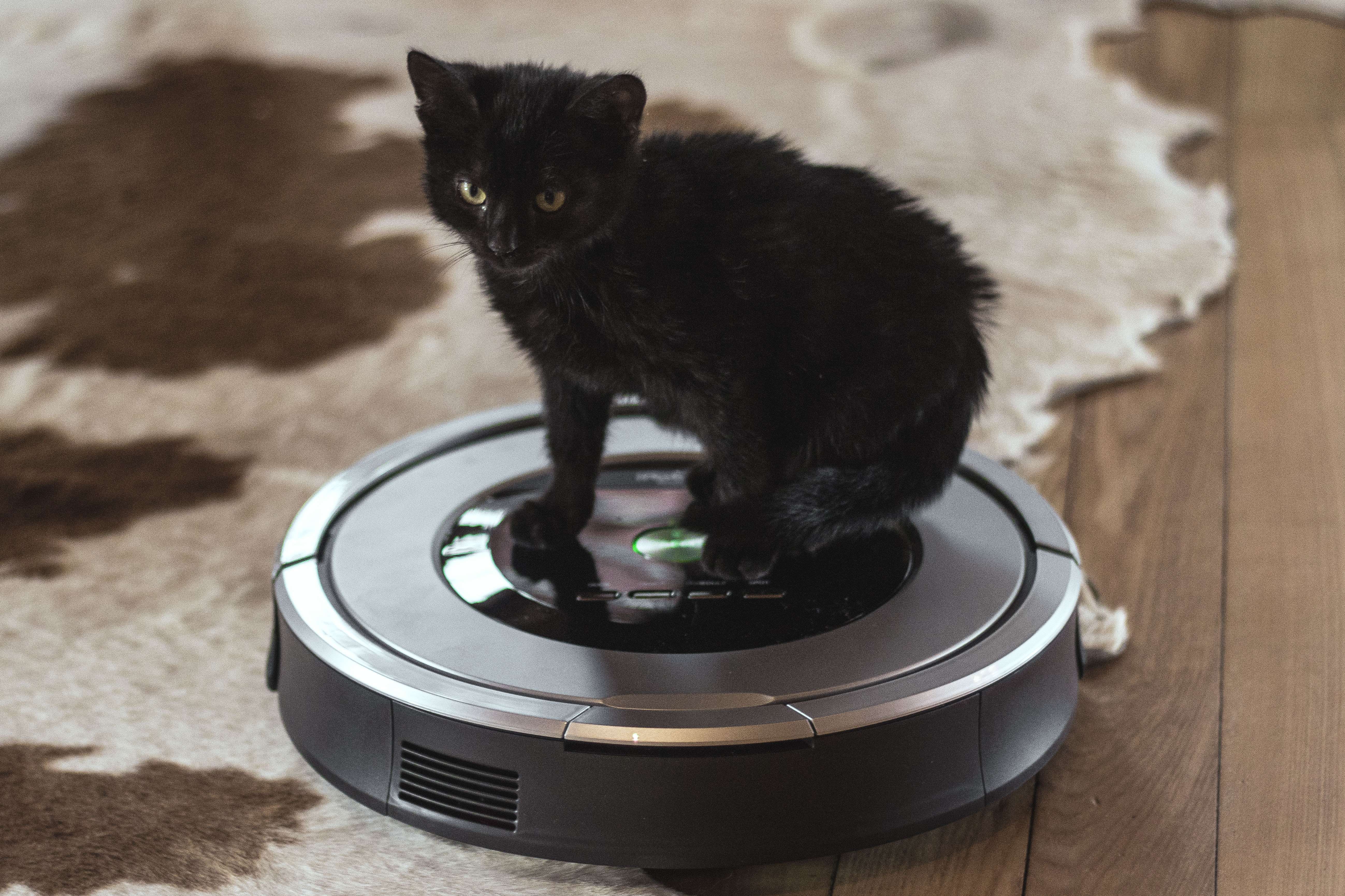 ale słodko wygląda ten kicia na roombie! Mój tez taki czaarny ale nie jeździ, a sama roomba świetna pomoc, my mamy od nie dawna E5
