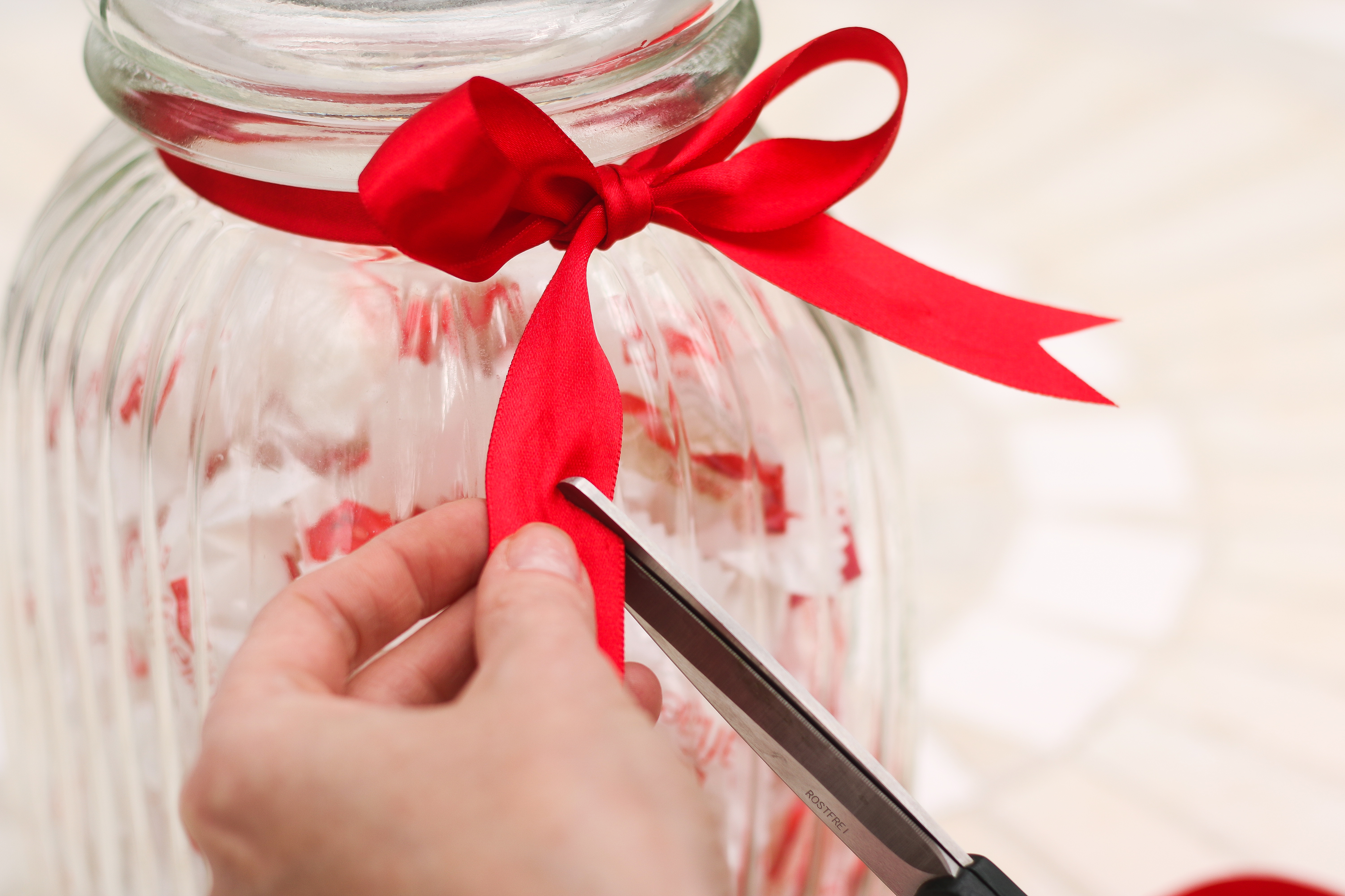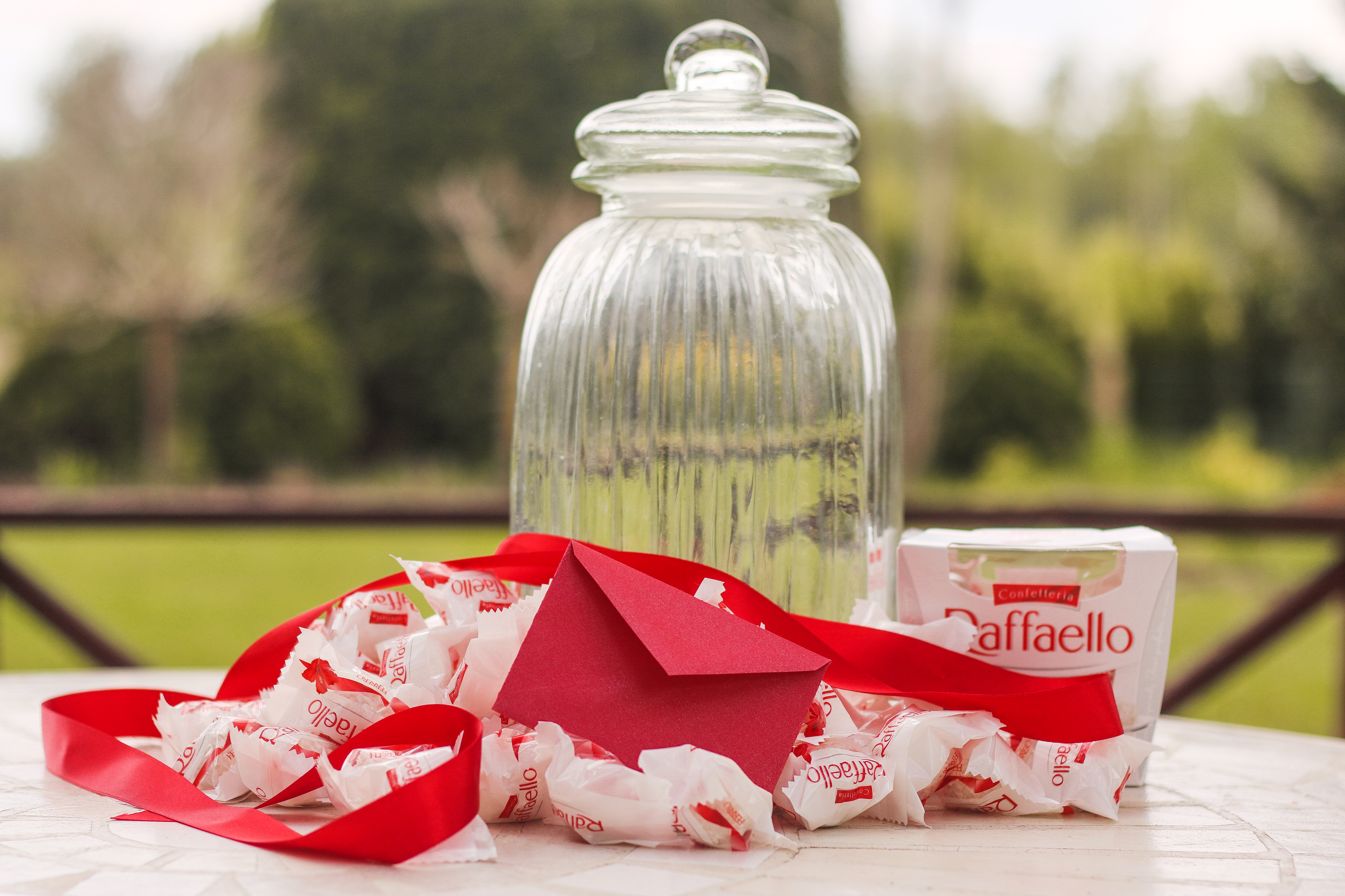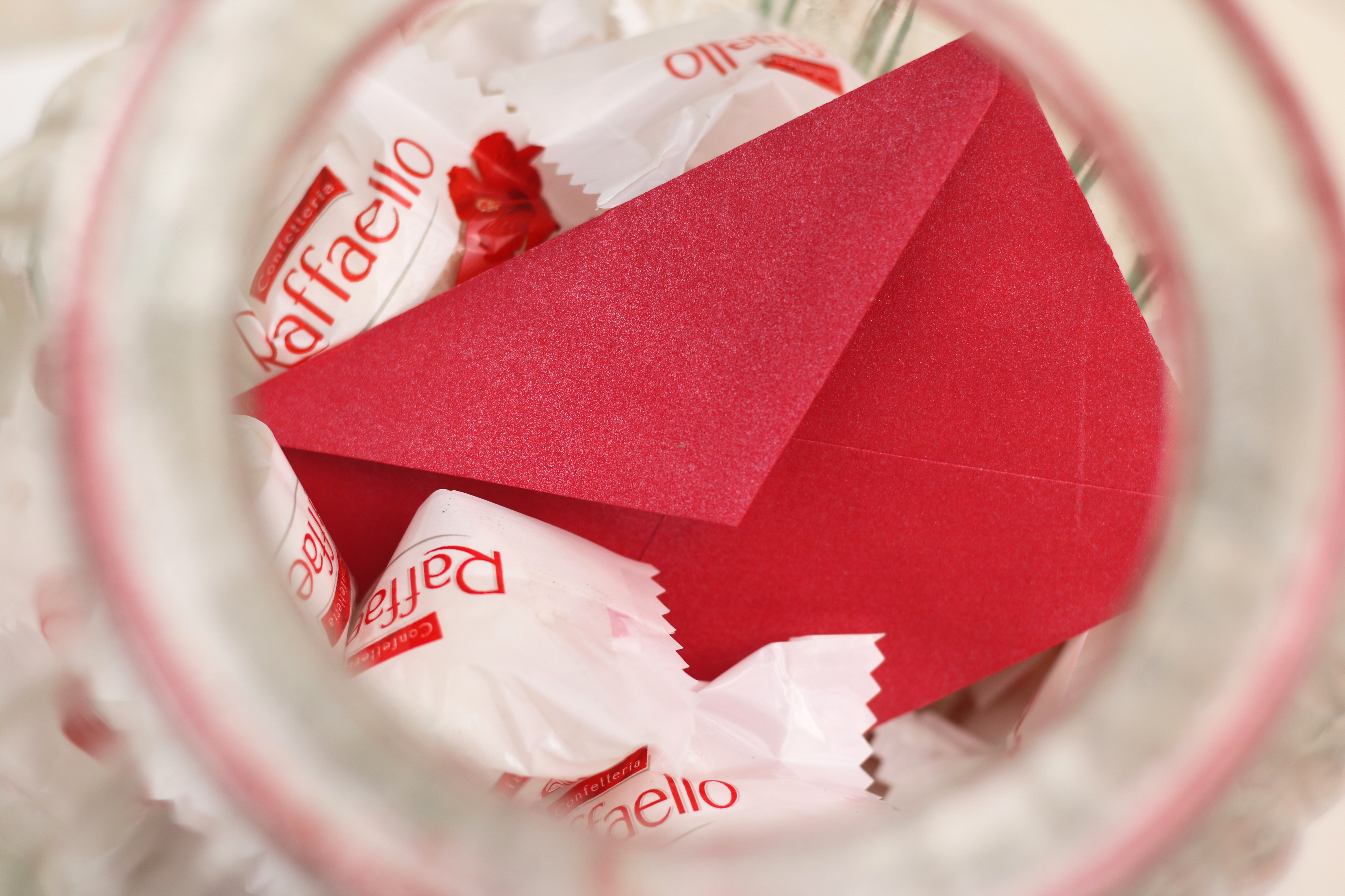 Do wysokości połowy słoja nasyp słodyczy. Do koperty (najlepiej kolorystycznie spójnej z kolorem opakowań czekoladek) włóż odpowiednią sumę. Dosyp łakoci do pełna i upewnij się, że koperta jest dobrze ukryta. Słój przewiąż wstążką i gotowe!