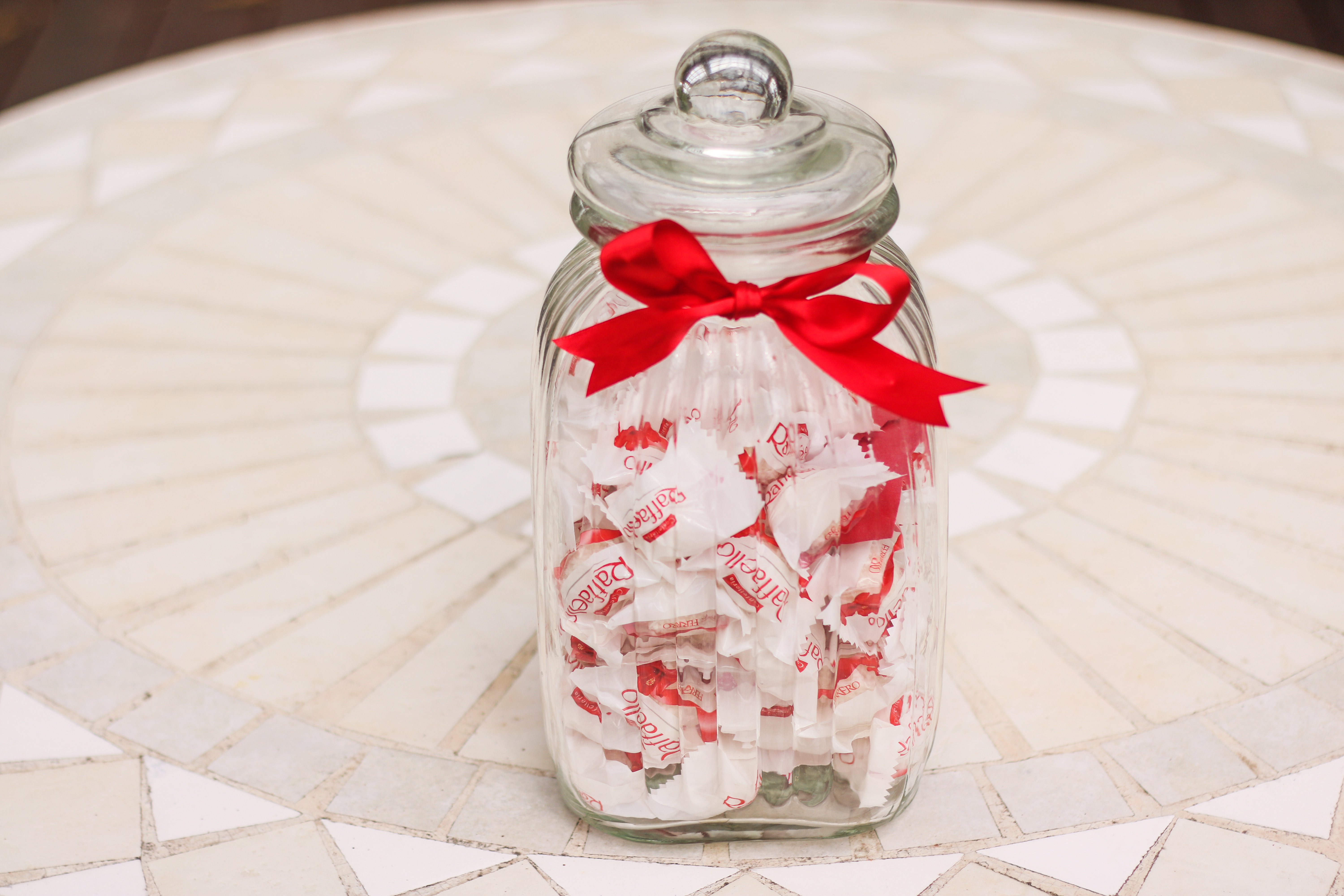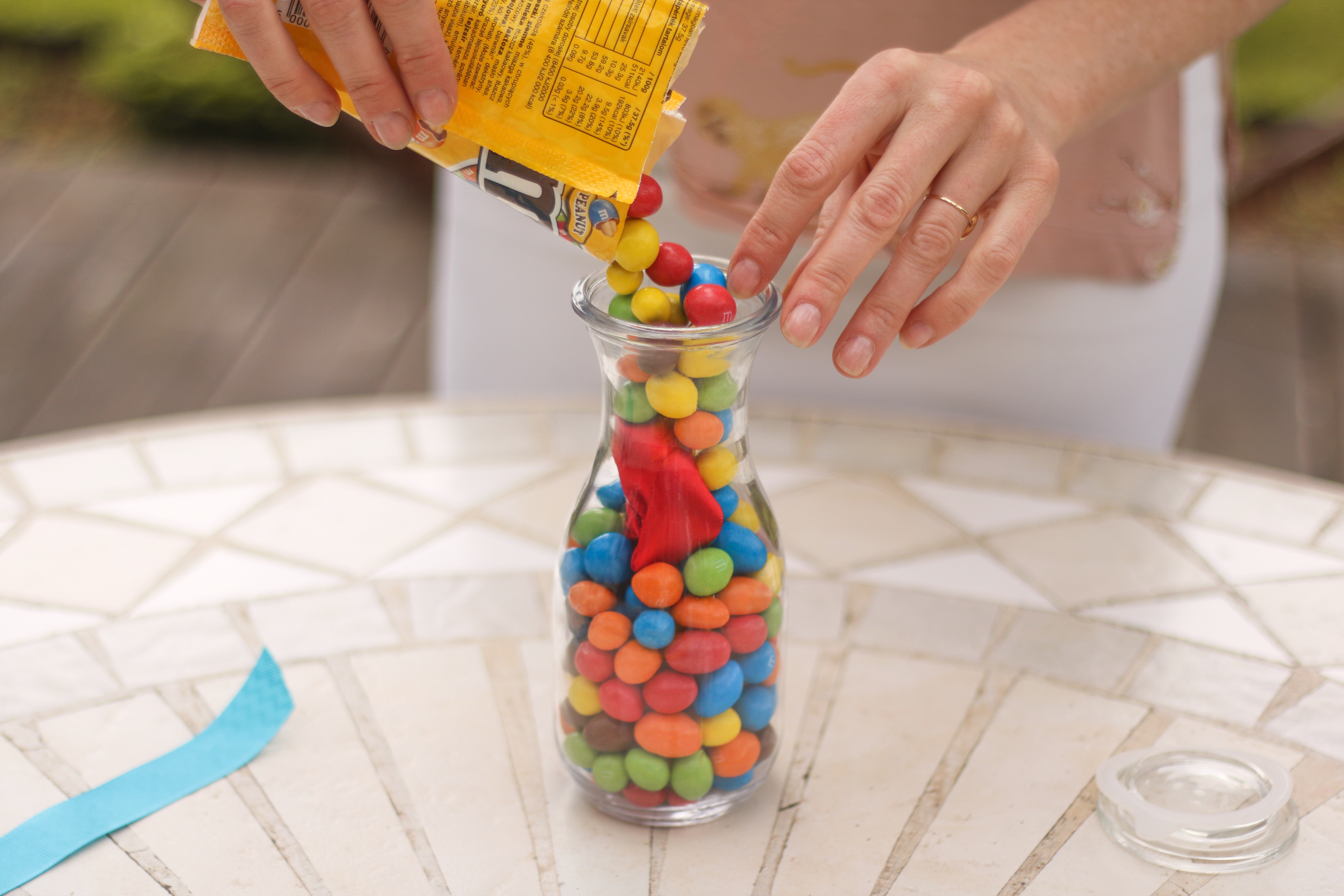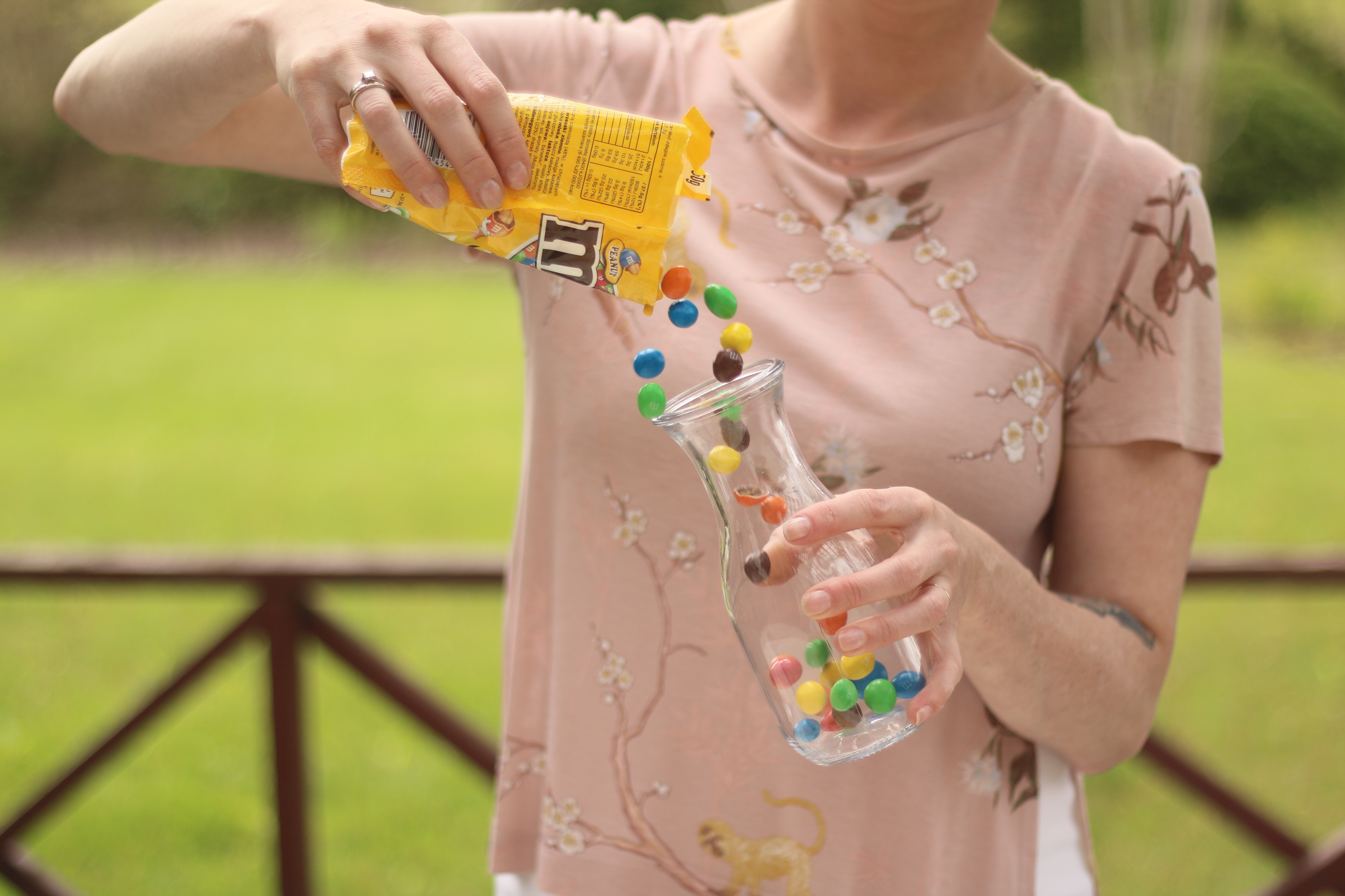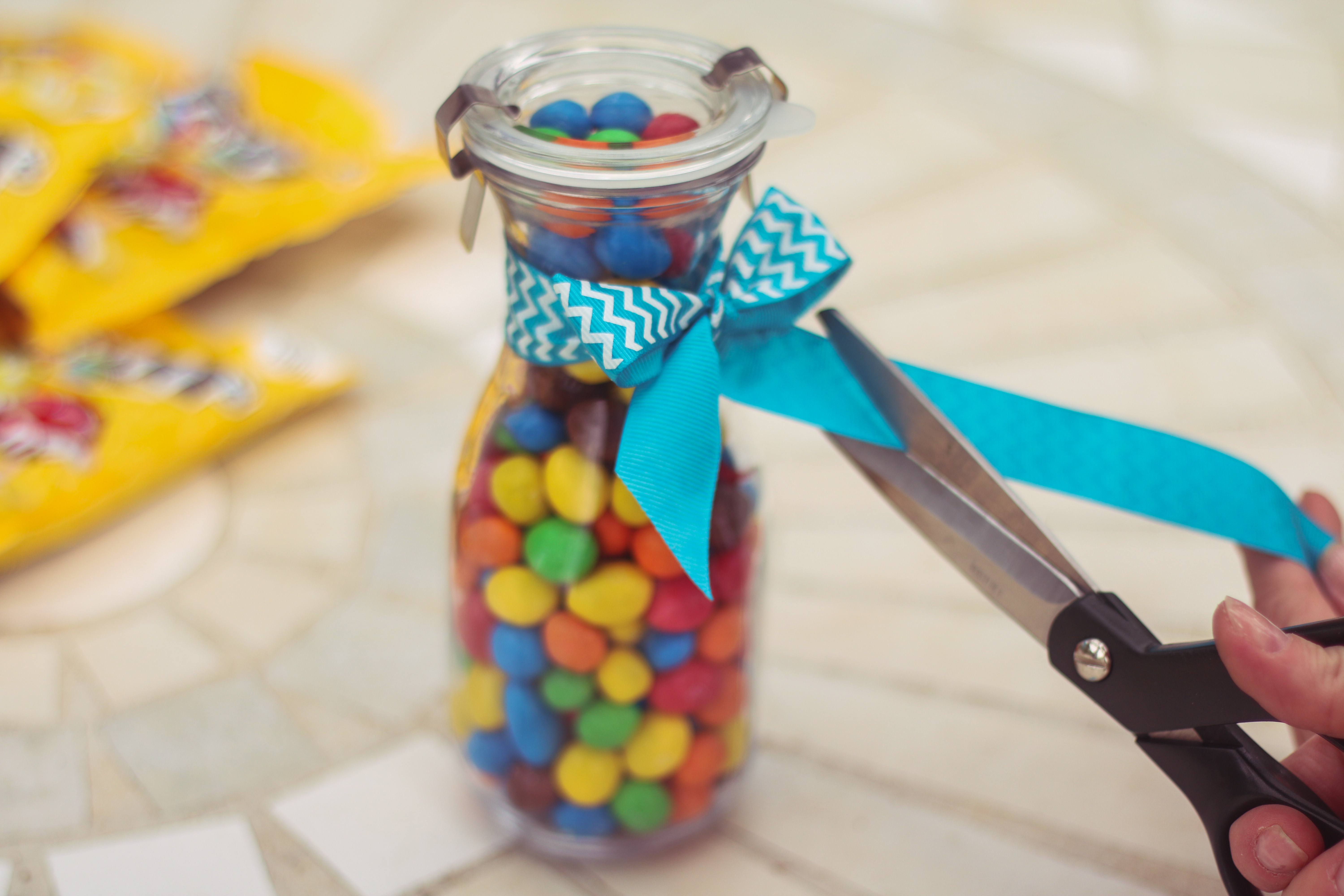 To wariacja na temat słoja, ale w mniejszej skali. Szklane naczynie możesz wybrać tu (www.weck.pl)  – pojemnik może być kulisty albo przypominać kolumnę. Zaopatrz się w odpowiednią ilość czekoladowych drażetek (ja wybrałam M&M’s, ale można także kupić kolorowe draże na wagę, w supermarkecie). Tym razem pieniądze trzeba będzie zwinąć w rulon – w mniejszym naczyniu koperta się nie zmieści. Zwitek trzeba zapakować albo w celofan albo w materiałową saszetkę, bo gotówka nie powinna dotykać cukierków bez opakowania. Na koniec znów wstążka, do której możecie także przypiąć bilecik z życzeniami.