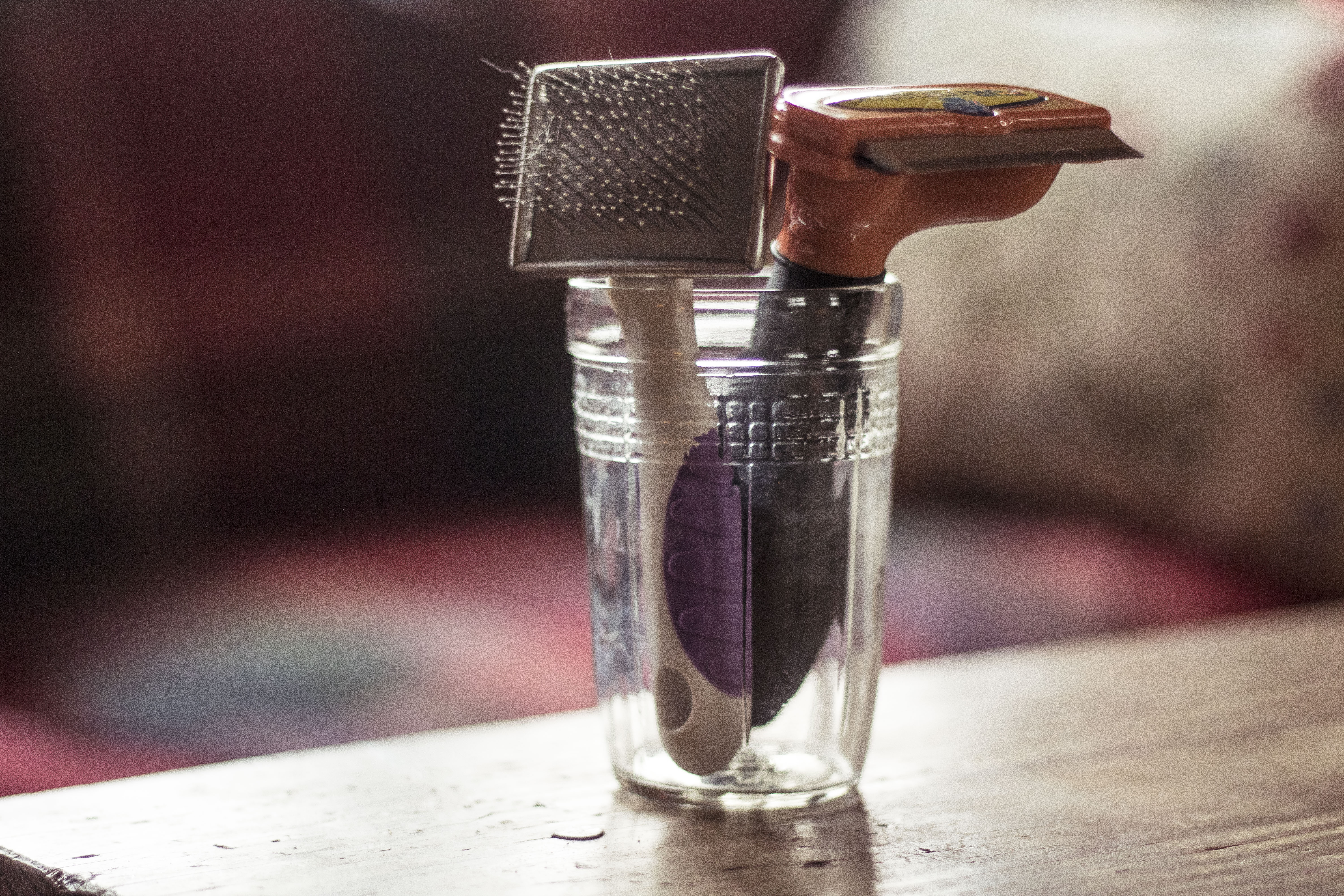 Zawsze koło kanapy mam szczotki do czesania psa i kota. Obie zatrzymują futro, więc włosy nie latają dookoła przy czesaniu, zatem mogę „małe czesanko” zrobić nawet na kanapie. A codziennie czesany pies czy kot zostawia potem mniej futra na meblach.