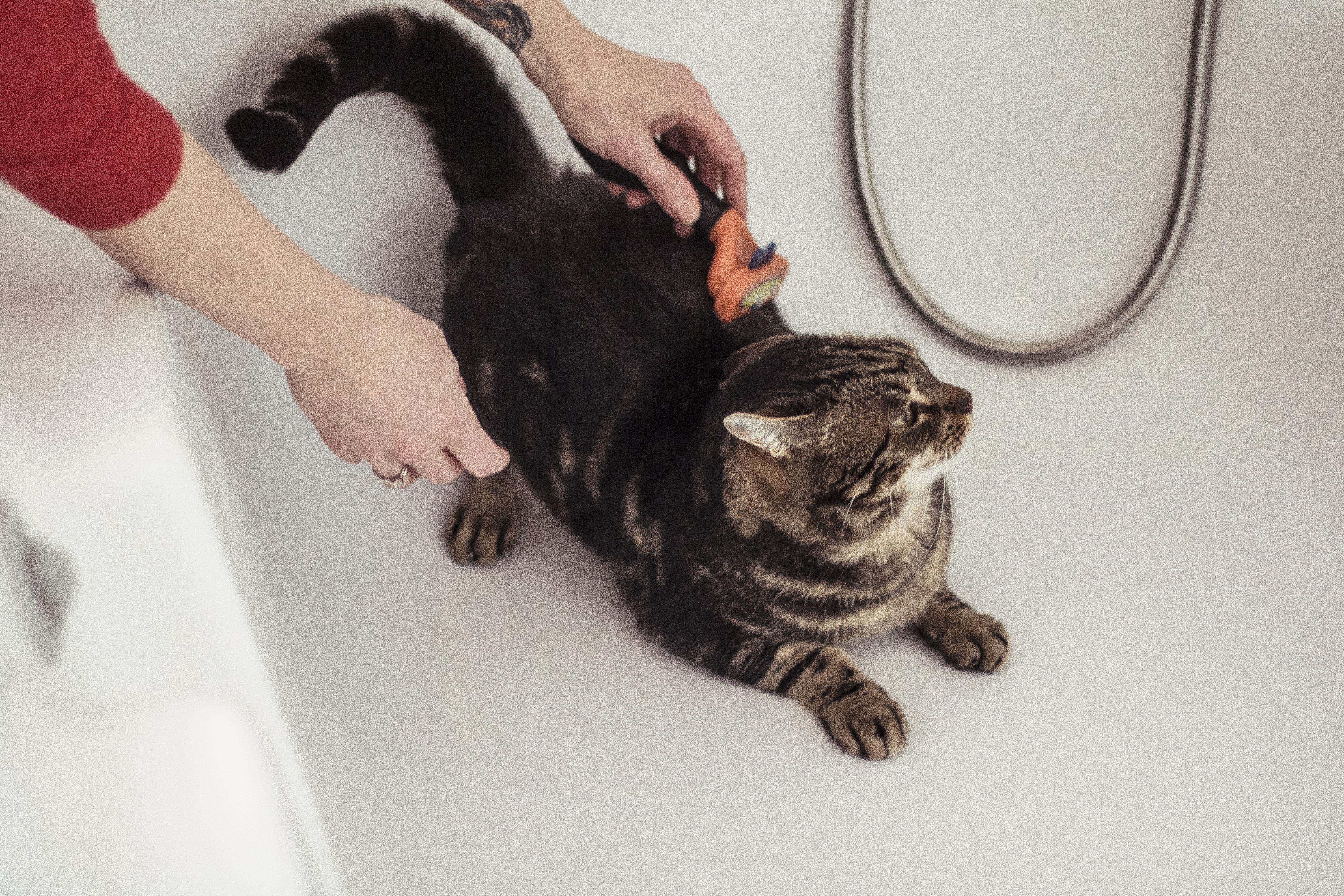 No może niekoniecznie… Ale czesanie w wannie koniecznie. O ile małe czesanie możecie zrobić gdziekolwiek, o tyle takie porządne, raz w tygodniu, oznacza kłęby kociej sierści latające wokoło. Dlatego najwygodniej wstawić kota do zmoczonej wcześniej wanny. Futro zatrzyma się na mokrych ścianach wanny i wystarczy je potem zebrać ręką, resztki opłukać prysznicem i gotowe!