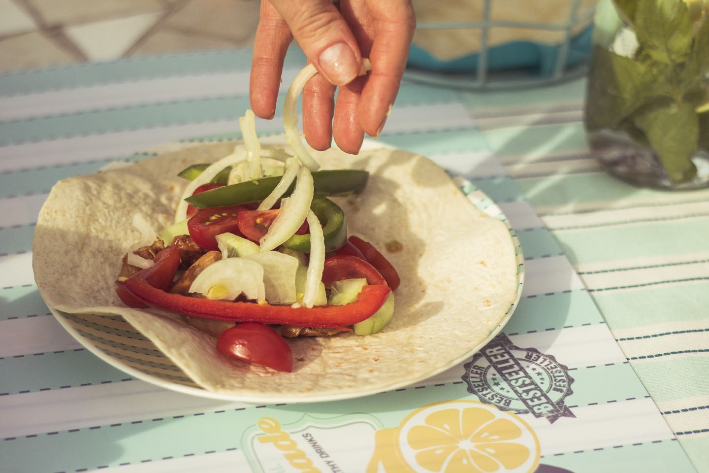 Każdy składnik szykuję w oddzielnym naczyniu, by miseczki mogły swobodnie krążyć wokół stołu i by goście mogli wybierać jakie dodatki pasują im najbardziej. W tortillę nakładamy sobie to, co najbardziej nam smakuje, zawijamy. Można zjeść bez sztućców, nawet na stojąco albo siedząc wygodnie na kocu. Danie smakuje nawet na zimno, więc nie trzeba się bawić w pojemniki termiczne 🙂