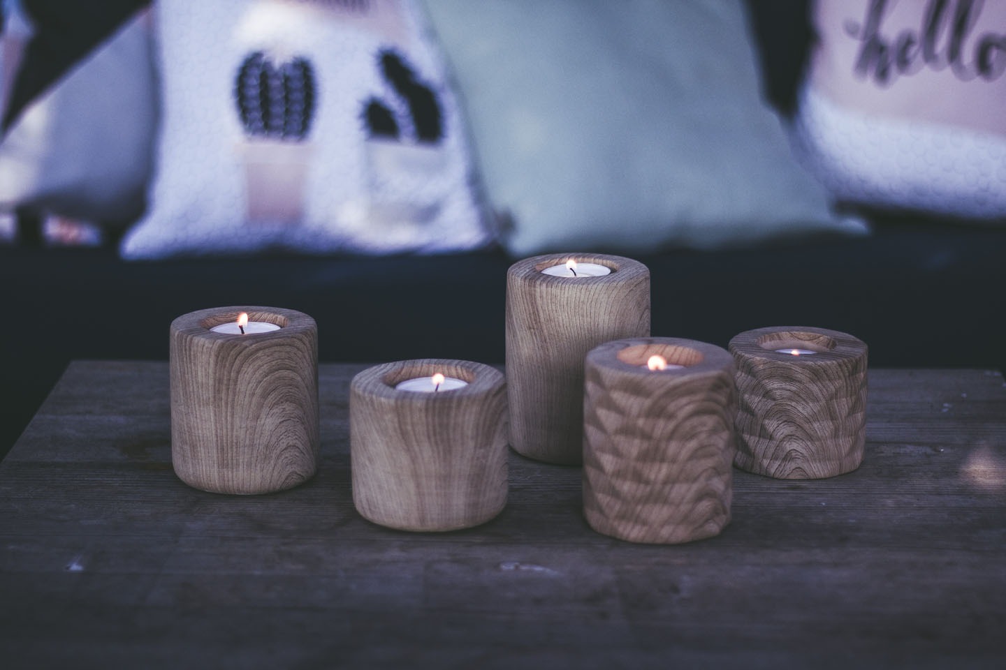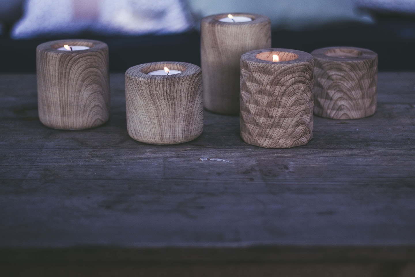 Pamiętacie moje ulubione wazony z odcinka o tym jak sprawić, by kwiaty stały dłużej [LIKN]? Otóż wazony mają swój „świecznikowy” odpowiednik. Uwielbiam używać tych a la drewnianych świeczników na tarasie, bo bardzo, bardzo pasują do otoczenia. Właściwie wtapiają się w nie. Świeczniki mają różną wysokość, więc można z nich tworzyć ciekawe kompozycje na przykład na środku stołu. I oczywiście równie dobrze jak na tarasie sprawdzają się w domu.