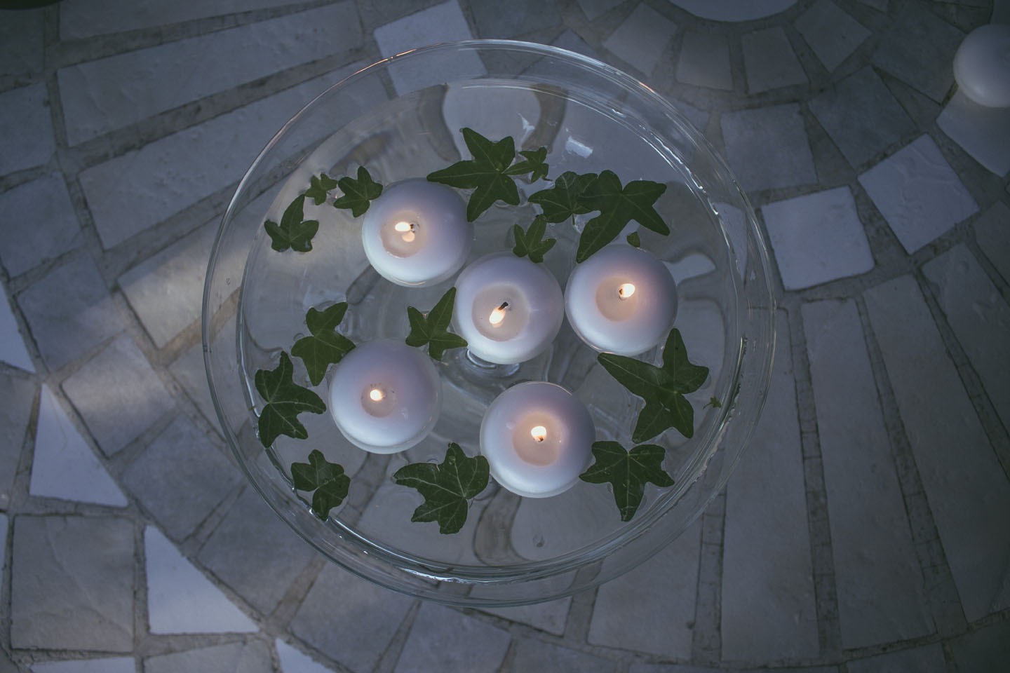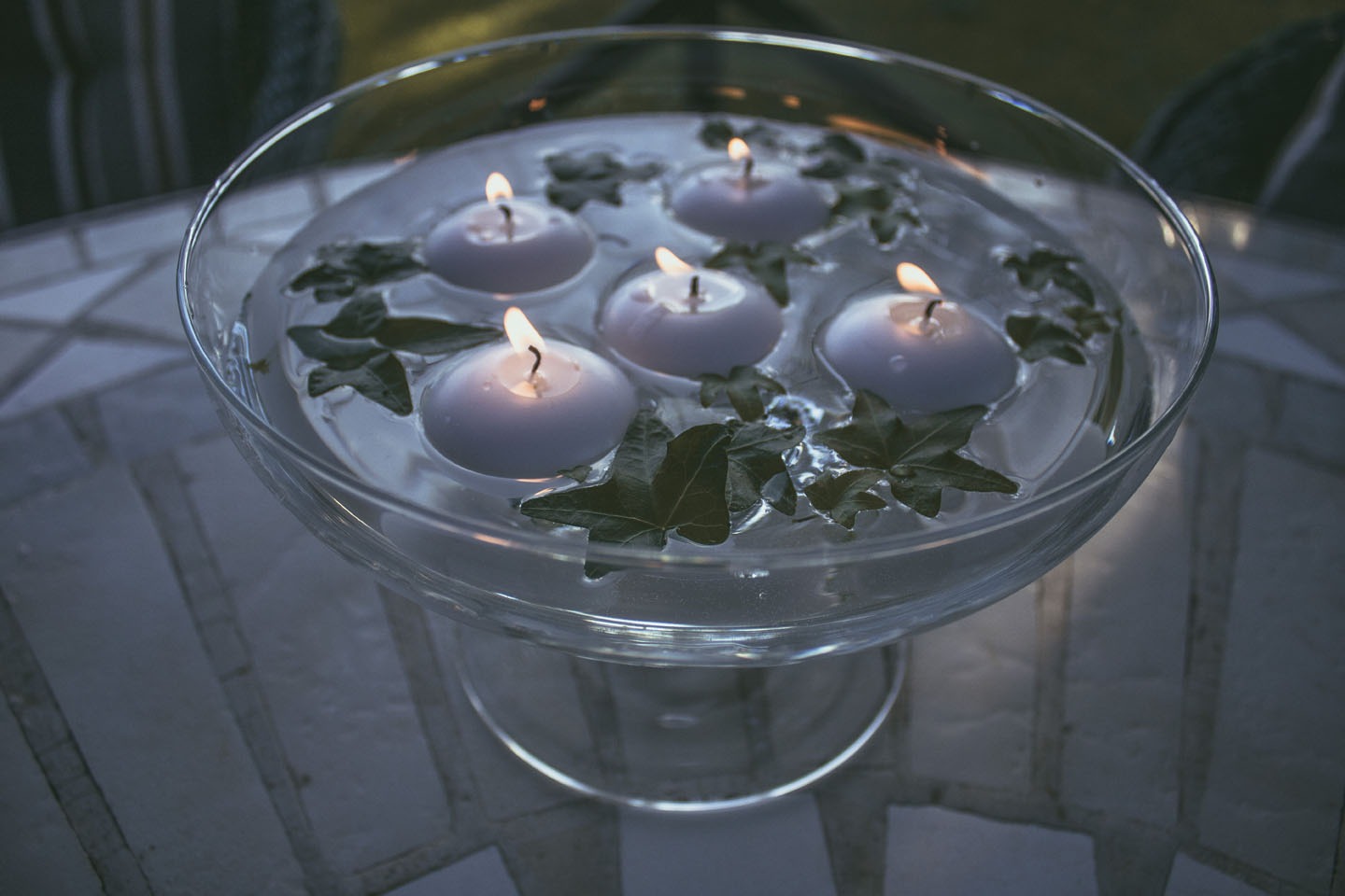 To jest tak naprawdę patera na owoce czy ciastka, ale ponieważ nie jest zupełnie płaska to zrobiłam z niej mały staw. Wystarczą pływające świeczki-tealights i kilka drobnych listków. Moim zdaniem lepiej prezentują się drobne listeczki na przykład bluszczu albo małe kwiaty. Taką kompozycję możecie ustawić na środku stołu albo też w kąciku, na mniejsztm stole. Patera ma tą zaletę, że ponieważ świeczki są w wodzie wosk nigdzie się nie rozleje i nie będzie kłopotliwego czyszczenia*.