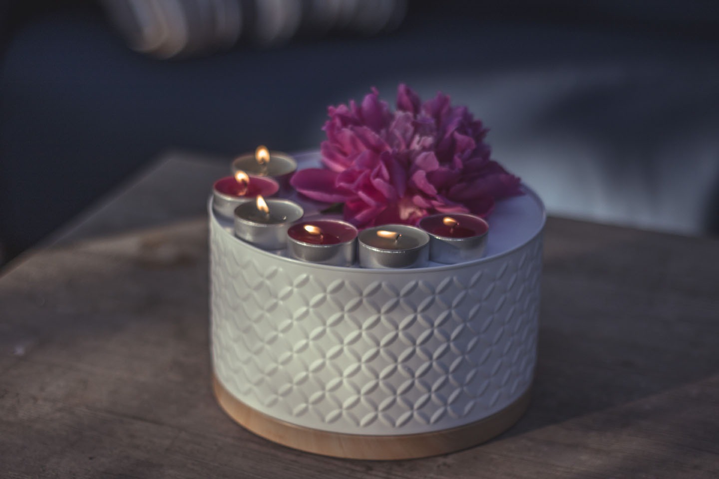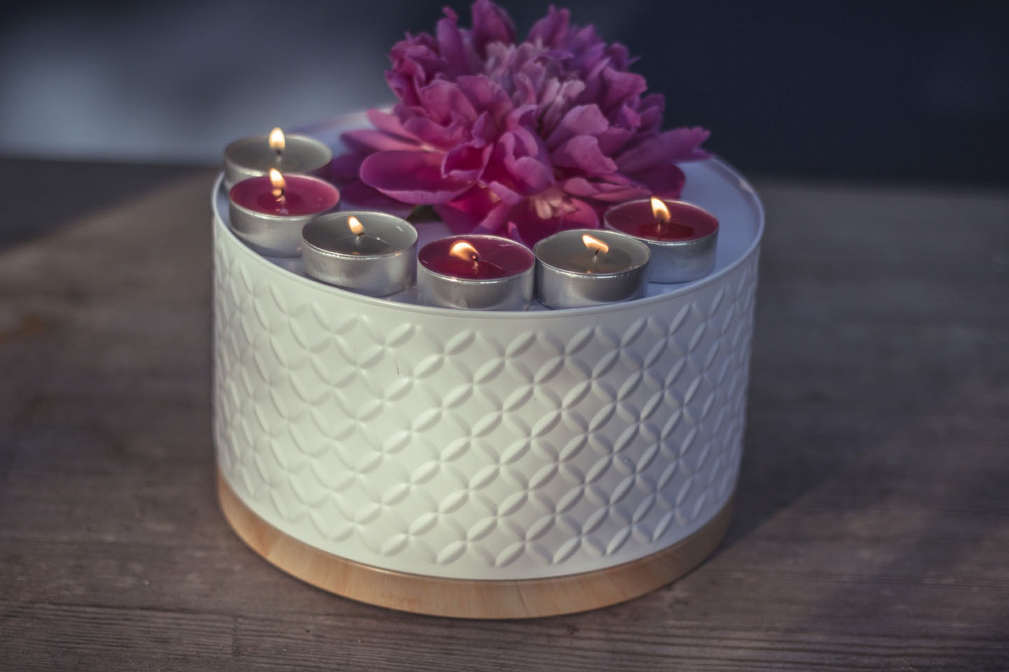 To nie jest świecznik, to puszka na ciastka. Tyle, że stoi do góry nogami 🙂 Lubię wymyślać nietradycyjne zastosowanie dla różnych przedmiotów i to mi zdecydowanie wyszło 🙂 Puszka ma na dole nieduży brzeg, który gwarantuje, że tealighty nie zsuną się przy przestawianiu. Obok postawiłam rozwiniętą piwonię (można ją ustawić także na malutkim talerzyku z wodą jeśli ma stać dłużej niż jeden wieczór. A samo pudełko może służych do przechowywania małych świeczek, żeby były zawsze pod ręką.