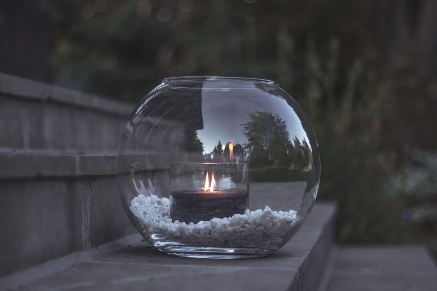 To jest tak naprawdę tradycyjny, kulisty wazon. Ale ponieważ nie lubię, kiedy coś stoi i się marnuje, a niestety nie dostaję kwiatów na tyle często, żeby wazon miał pełne ręce roboty to wykorzystałam do do świec. W środku stoi świeca, która swoje przeszła… Kto śledzi mnie na insta wie o co chodzi, a dla wszystkich opiszę to kiedyś szczegółowo, bo przy okazji dostałam świetne porady jak radzić sobie ze stłuczoną świecą w słoiku. Tak czy siak świeca zyskała nowe opakowanie. I teraz wstawiłam ją do kuli, obsupując dookoła dekoracyjnym żwirem z kwiaciarni, żeby się nie przesuwała. Wygląda obłędnie, a ponieważ szklane osłony są dwie, to także zupełnie inaczej rozprasza światło! Moja kula jest naprawdę olbrzymia, ale możecie to samo wykonać z mniejszych wazonów.