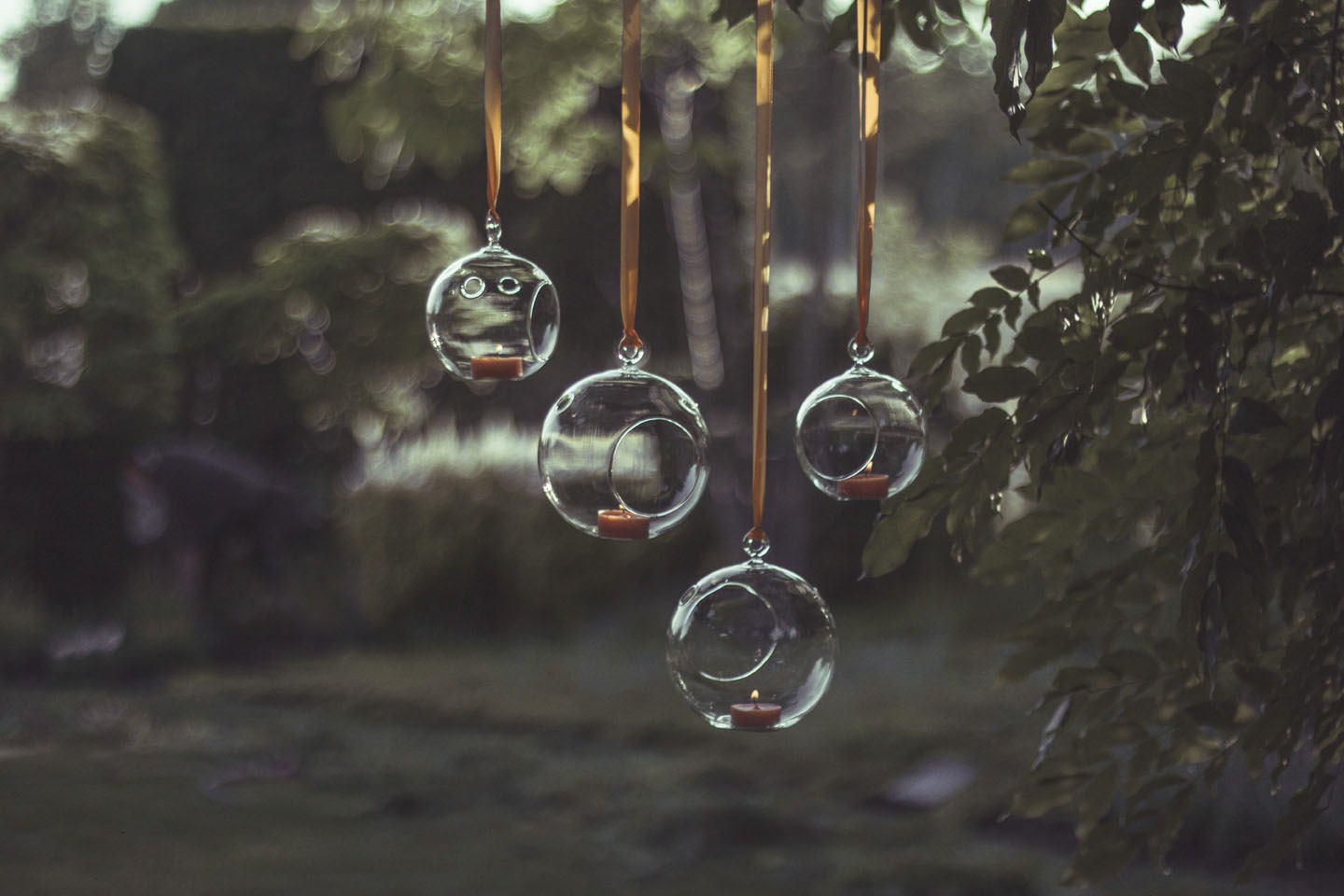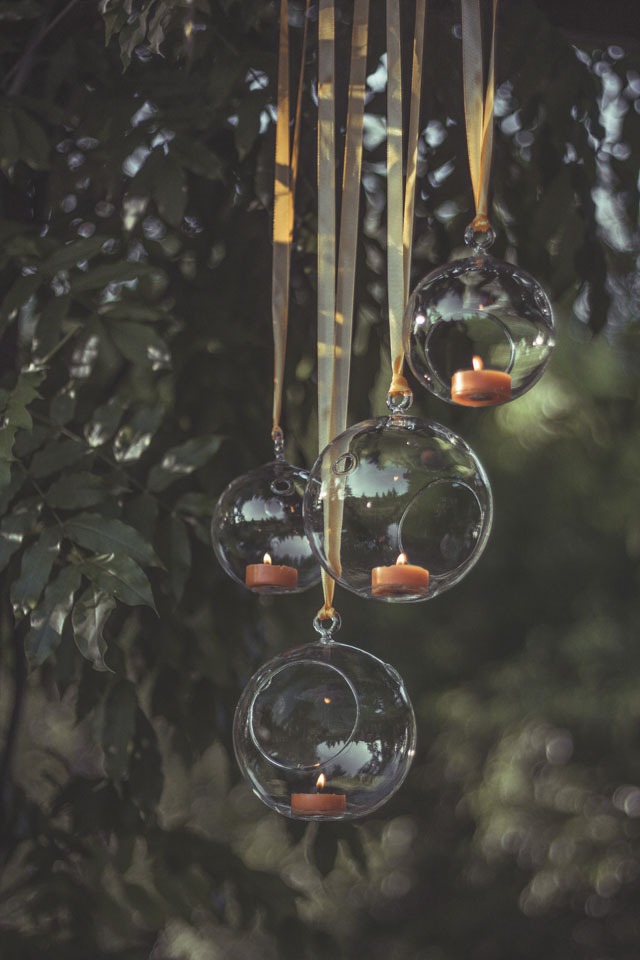To jest mój ulubiona dekoracja tego sezonu. Zwariowałam na punkcie tych kul! Mam ich tylko kilka, ale już planuję kupić dużo, dużo więcej, żeby obwiesić nimi caluteńki taras! Można je przywiązywać za „uszko”, ale także stawiać na stole. Mają u góry dziurki, dzieki którym kula nie nagrzewa się mocno i nie brudzi od środka dymem. Są pękate i piękne i w dodatku w różnych rozmiarach. Do środka można włożyć tealight bez osłonki (to wygląda o wiele lepiej niż w aluminiowym ubranku, ale oznacza konieczność czyszczenia potem) albo pływające małe świeczki, które wyglądają obłędnie, bo są bardziej zaokrąglone w kształcie i to do kul bardzo pasuje. Ja wybrałam pomarańczowe tealighty do wstążki w tym samym kolorze, ale docelowo powieszę wszystkie kule na pojedynczych, niebieskich wstążkach i będę wkładać do nich białe tealighty.
