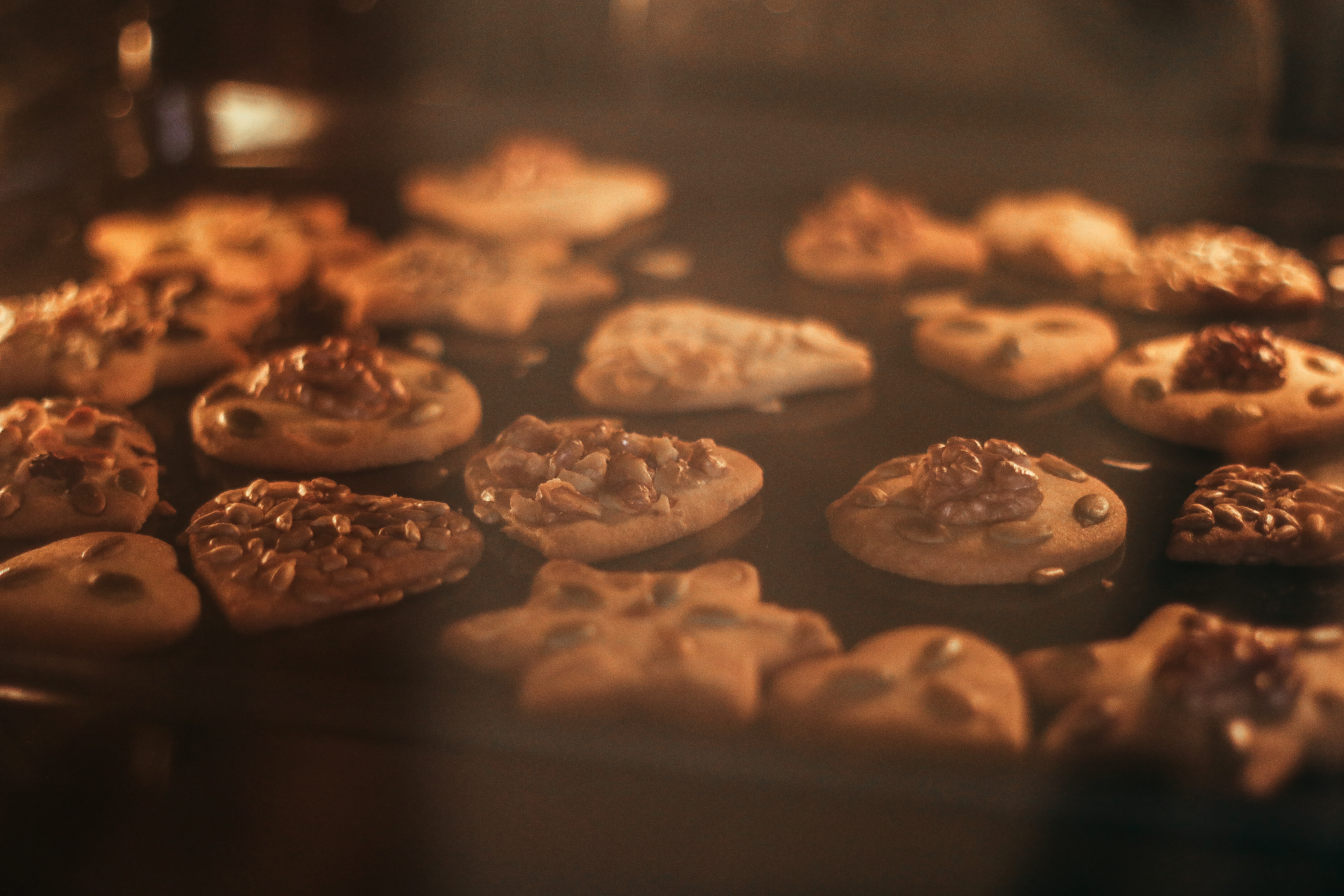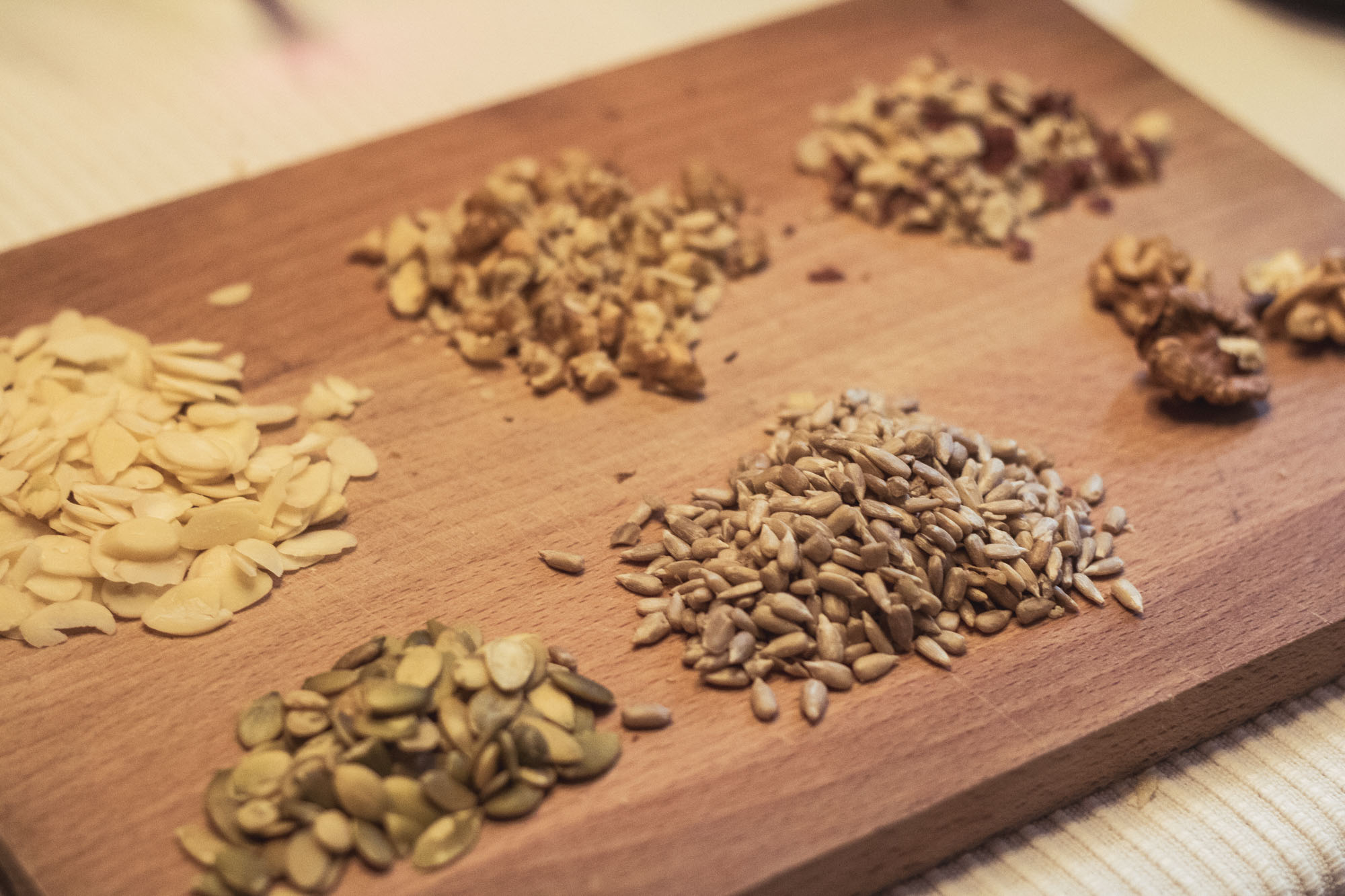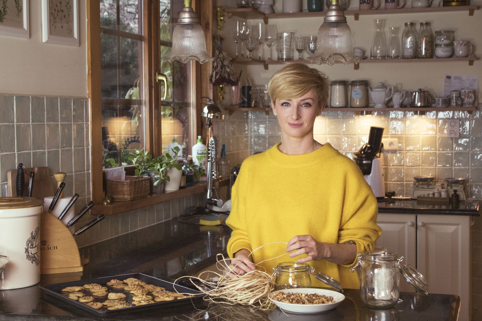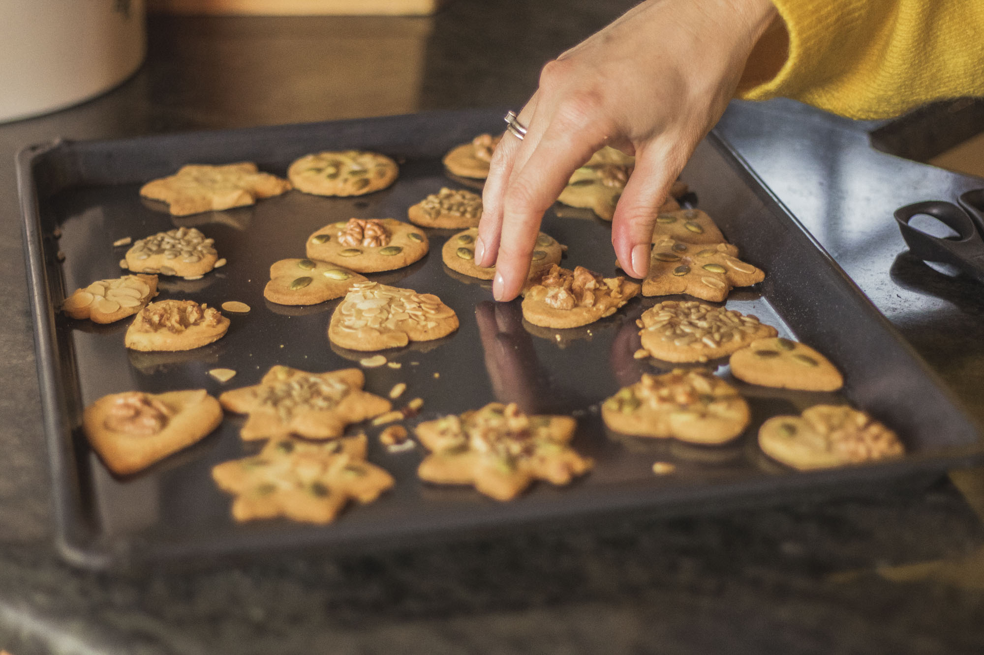 Na dobry początek przygotujcie ciasteczka: mogą być na przykład maślane. Ja wykorzystałam przepis z najnowszej książki Ani Starmach, w której znajdziecie wiele przepisów na potrawy, które dzieci mogą przygotować z niewielką pomocą dorosłych. Ale proste przepisy znajdziecie także w sieci. Ważne, żeby ciasteczka dały się zrobić szybko. Przed upieczeniem ciastka udekorowaliśmy pestkami dyni, słonecznika, płatkami migdałów i posiekanymi orzechami. Zależało nam na naturalnym, stonowanym efekcie, ale jeśli macie ochotę na coś bardziej kolorowego upieczcie ciasteczka solo, a kiedy ostygną udekorujcie je płynnym lukrem, flamastrami lukrowymi i posypkami.