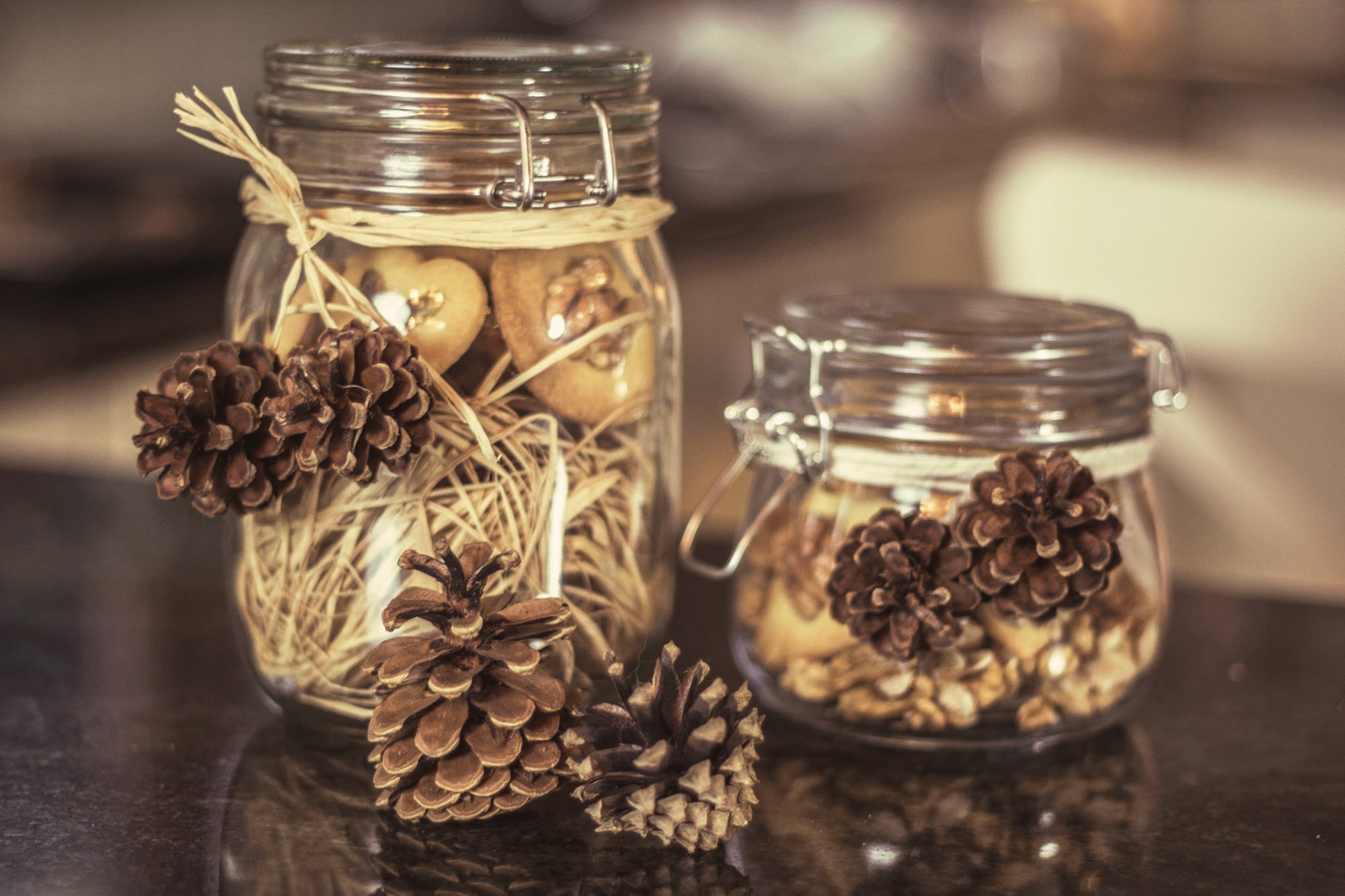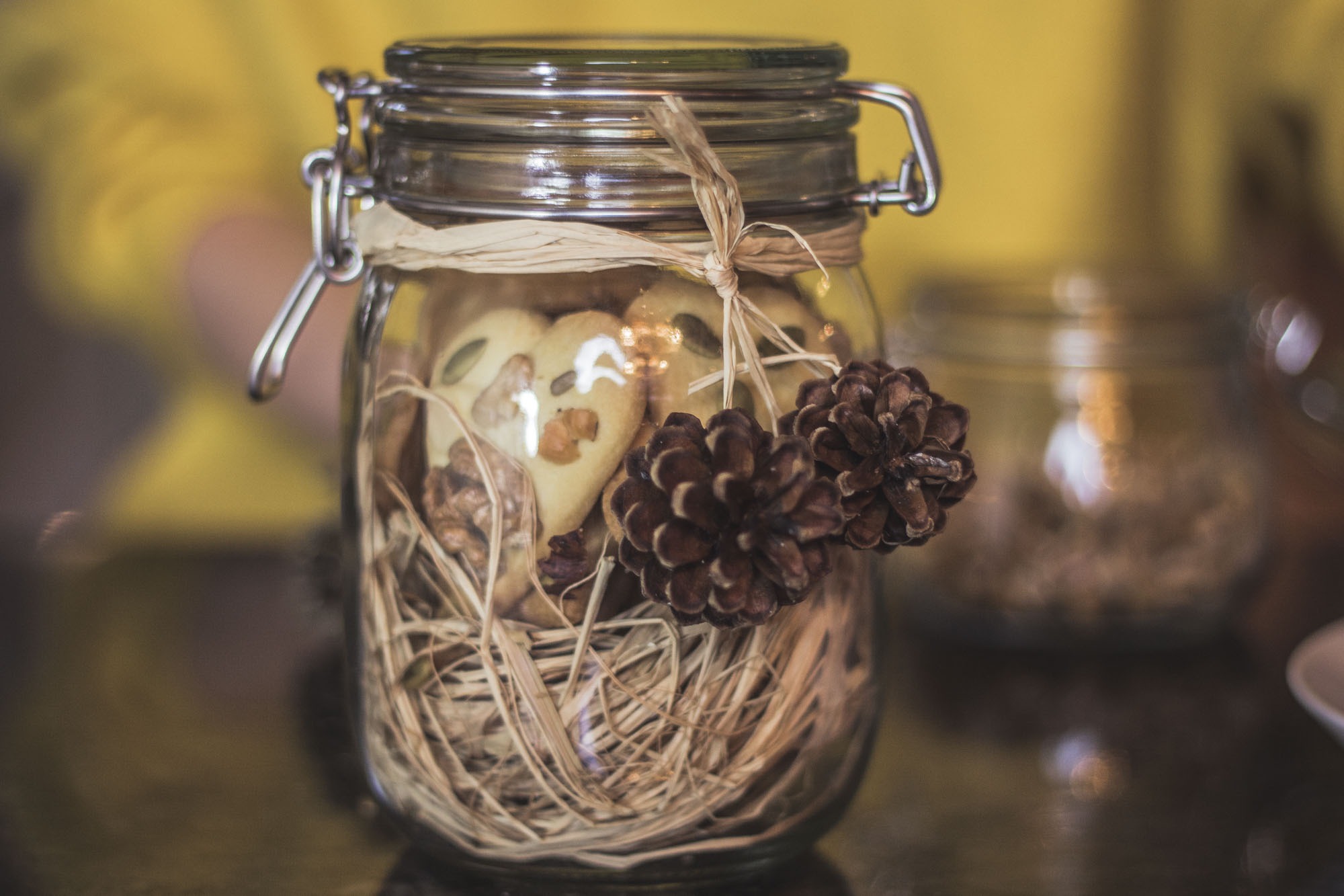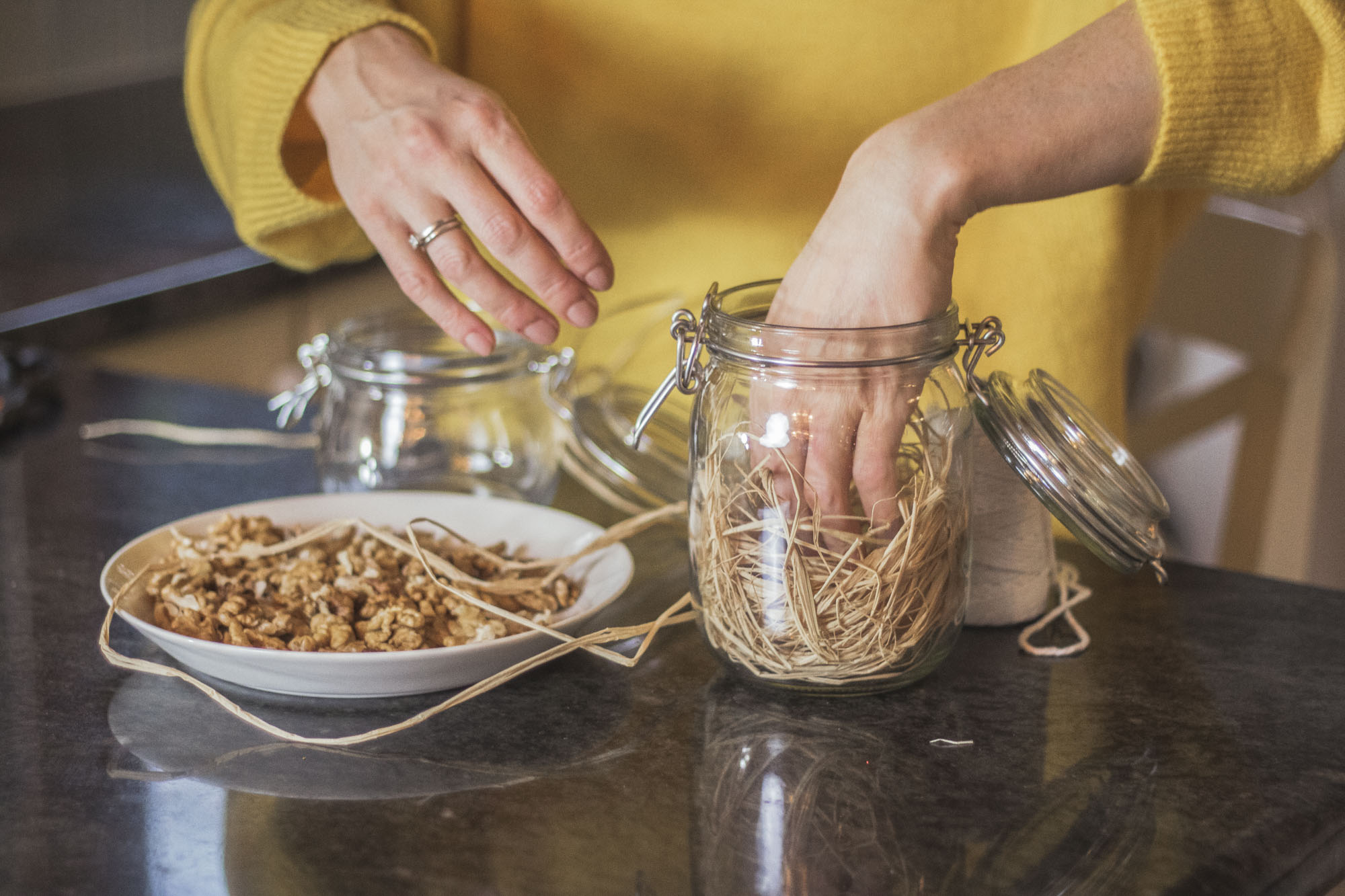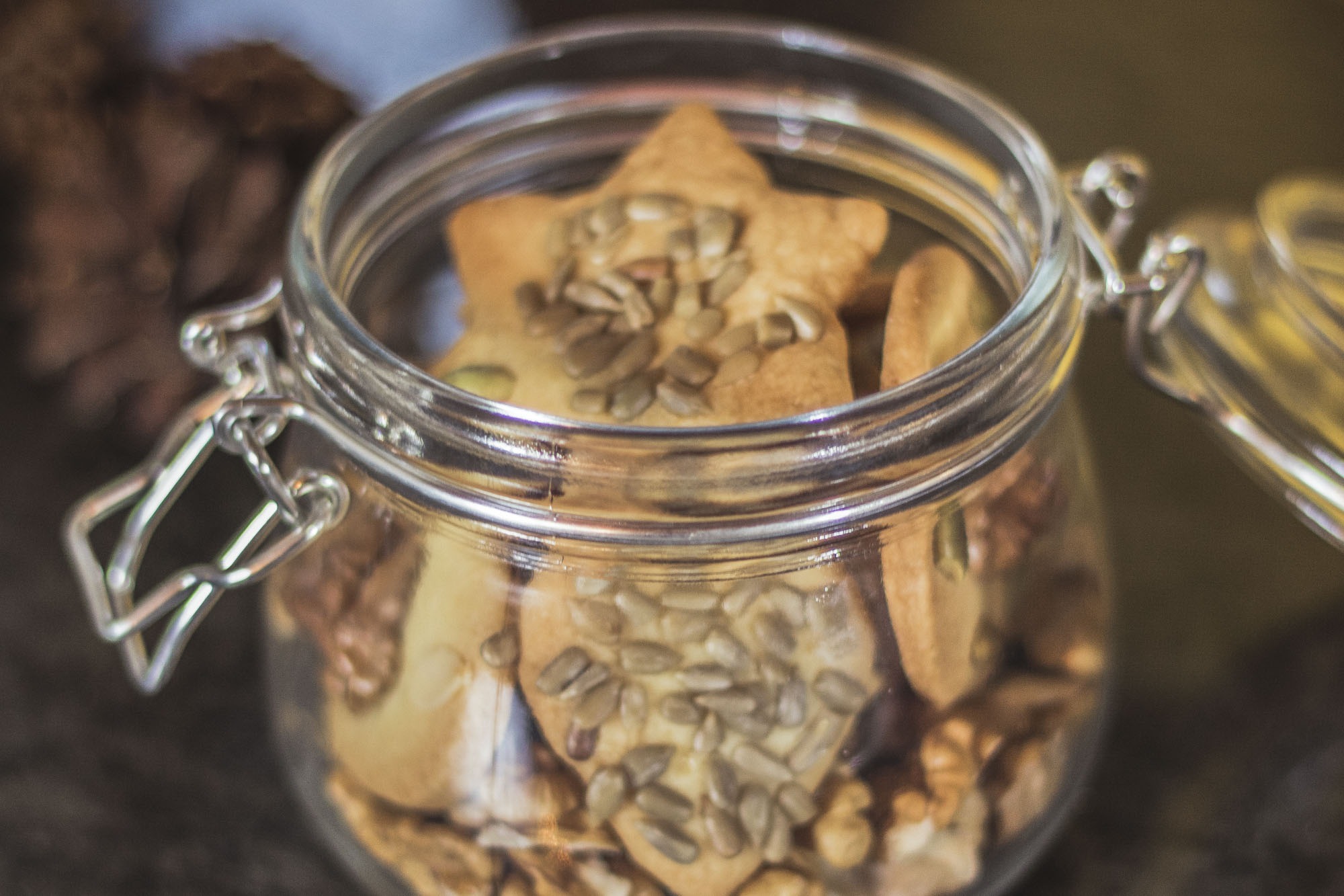 Kiedy ciasteczka są gotowe przygotujcie odpowiednie naczynie: to może być puszka albo pudełko, ale prezent będzie o wiele bardziej atrakcyjny jeśli pojemnik będzie przeźroczysty. Ja wybrałam słoik z wekowym zamknięciem. Dno wymościłam rafią, można dorzucić parę orzechów. W wersji kolorowej wykorzystajcie raczej bibułę albo papierowe wiórki. Słoik przewiązałam rafią, ale czerwona czy zielona wstążka też będzie wyglądała super. Ciasteczka z książki ani są tak pyszne, że oczywiście nie dotrwały do Świąt (całe szczęście, że dotrwały do końca sesji zdjęciowej, bo znikały w tajemniczy sposób), pamiętacie więc, żeby upiec spory zapas.