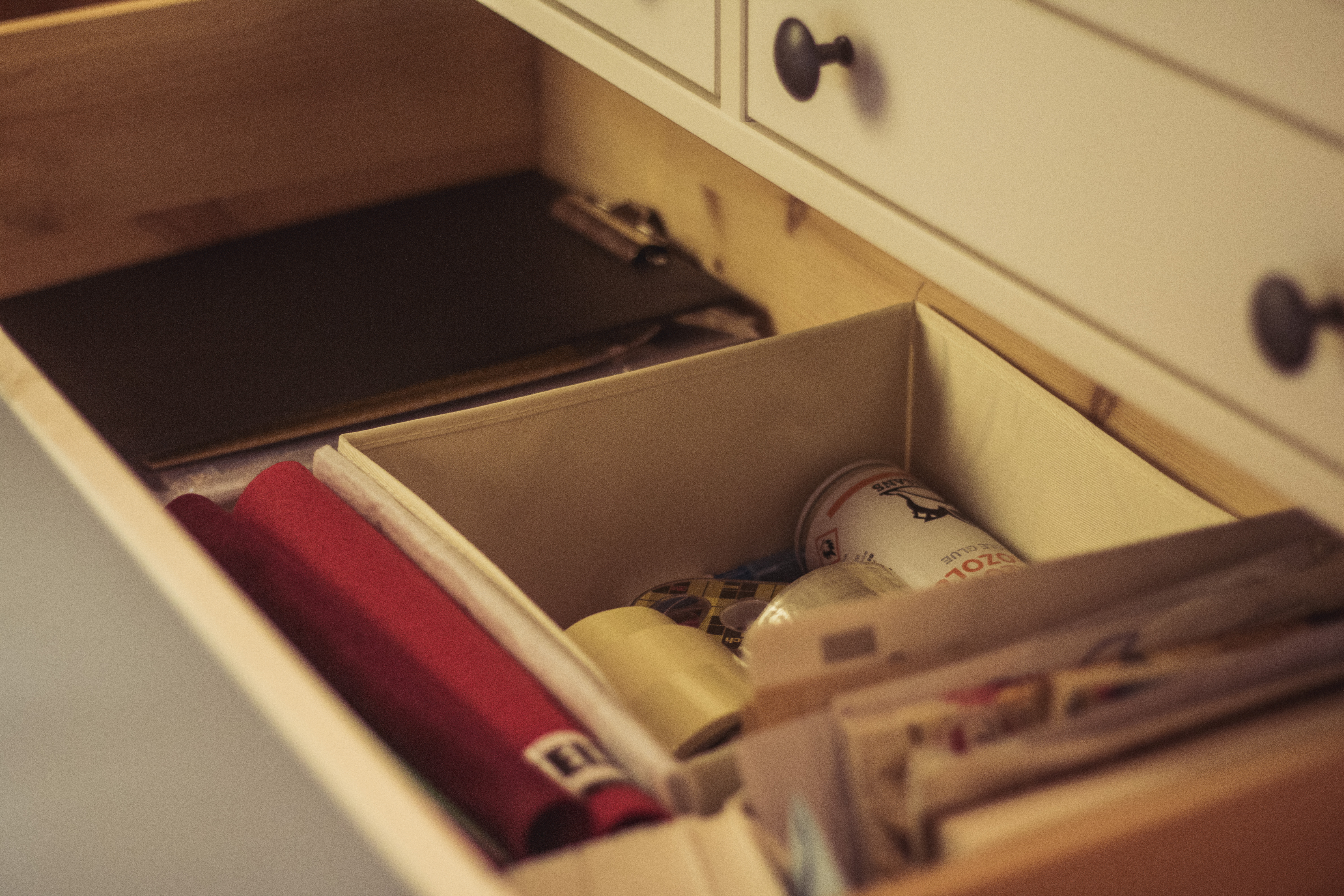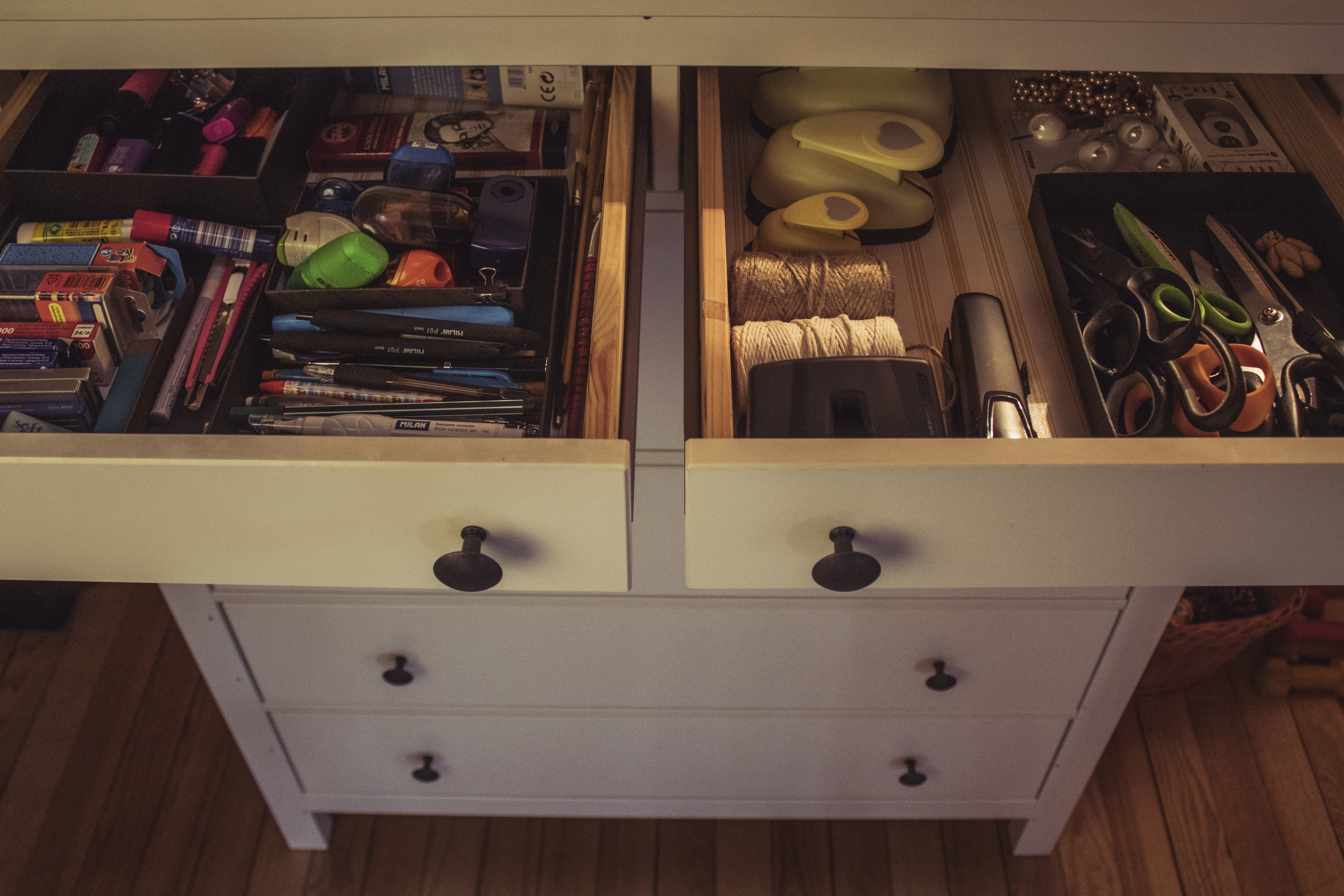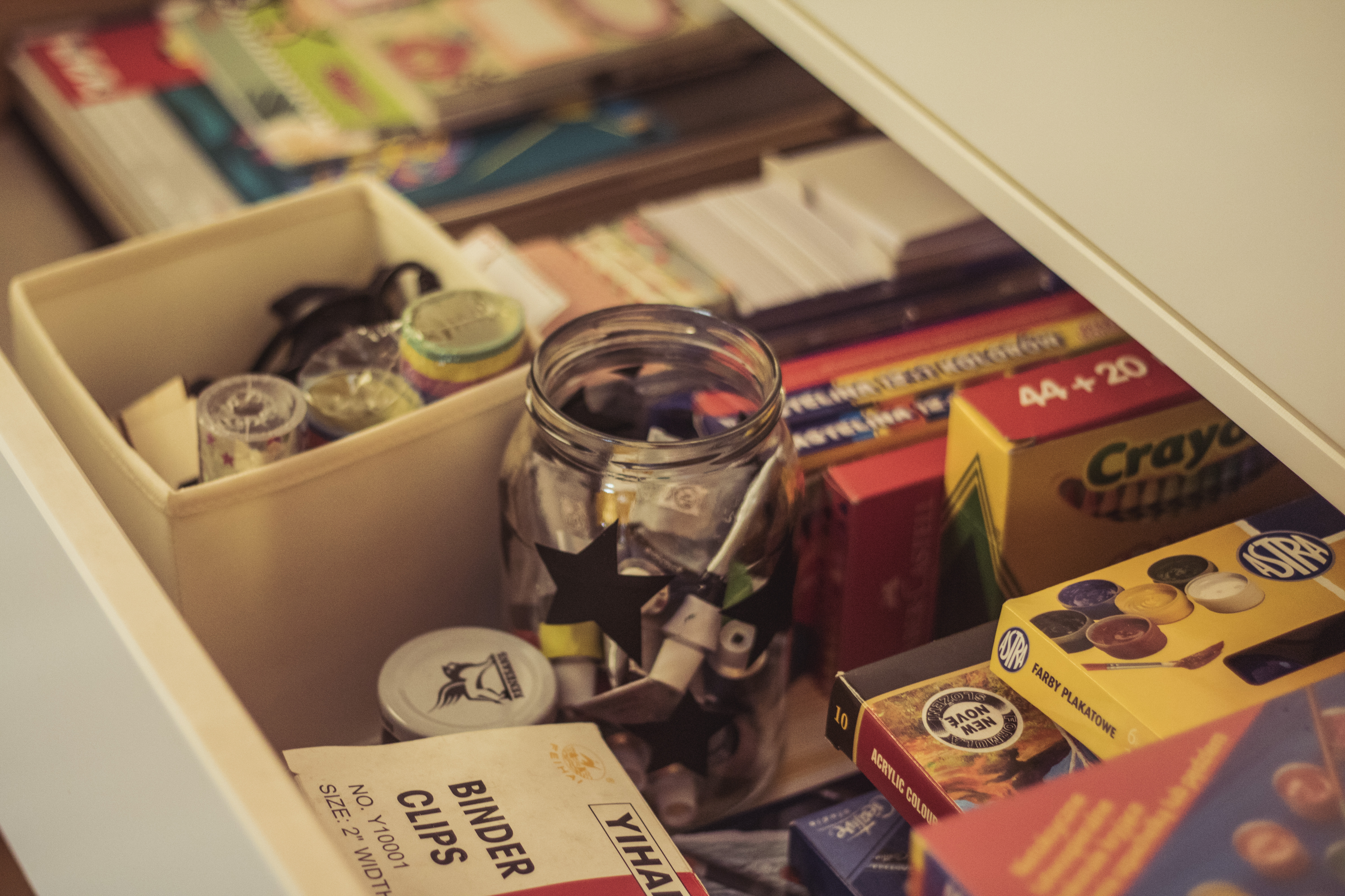 Mam w domu komodę z sześcioma szufladami, w której jest prawie wszystko. Zawsze kiedy Rysio o 22 przypomina sobie, że na drugi dzień ma przynieść do szkoły modelinę, kiedy coś się popsuje, kiedy nagrywam odcinek na YouTube i nagle potrzebne mi żółte pióra 🙂