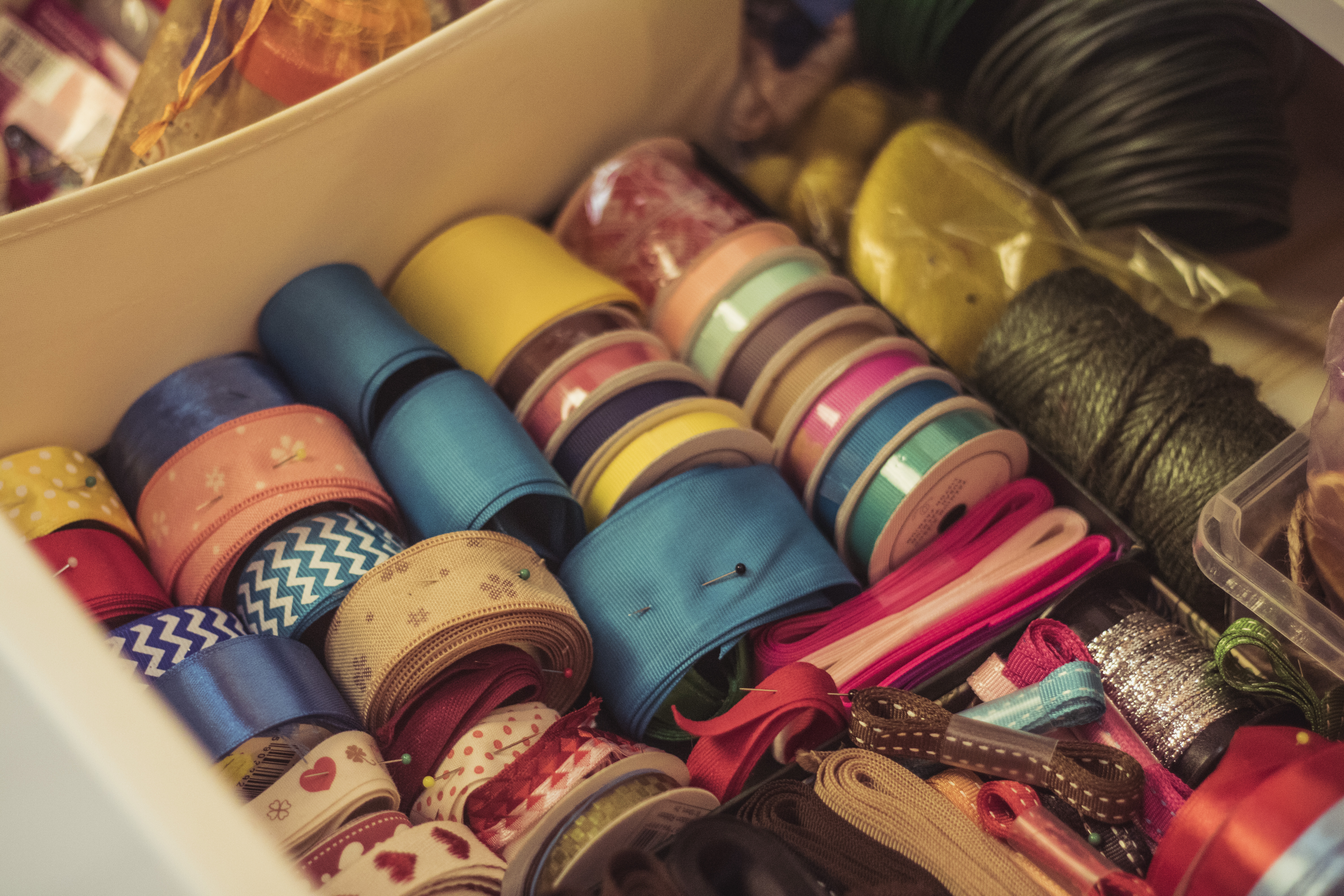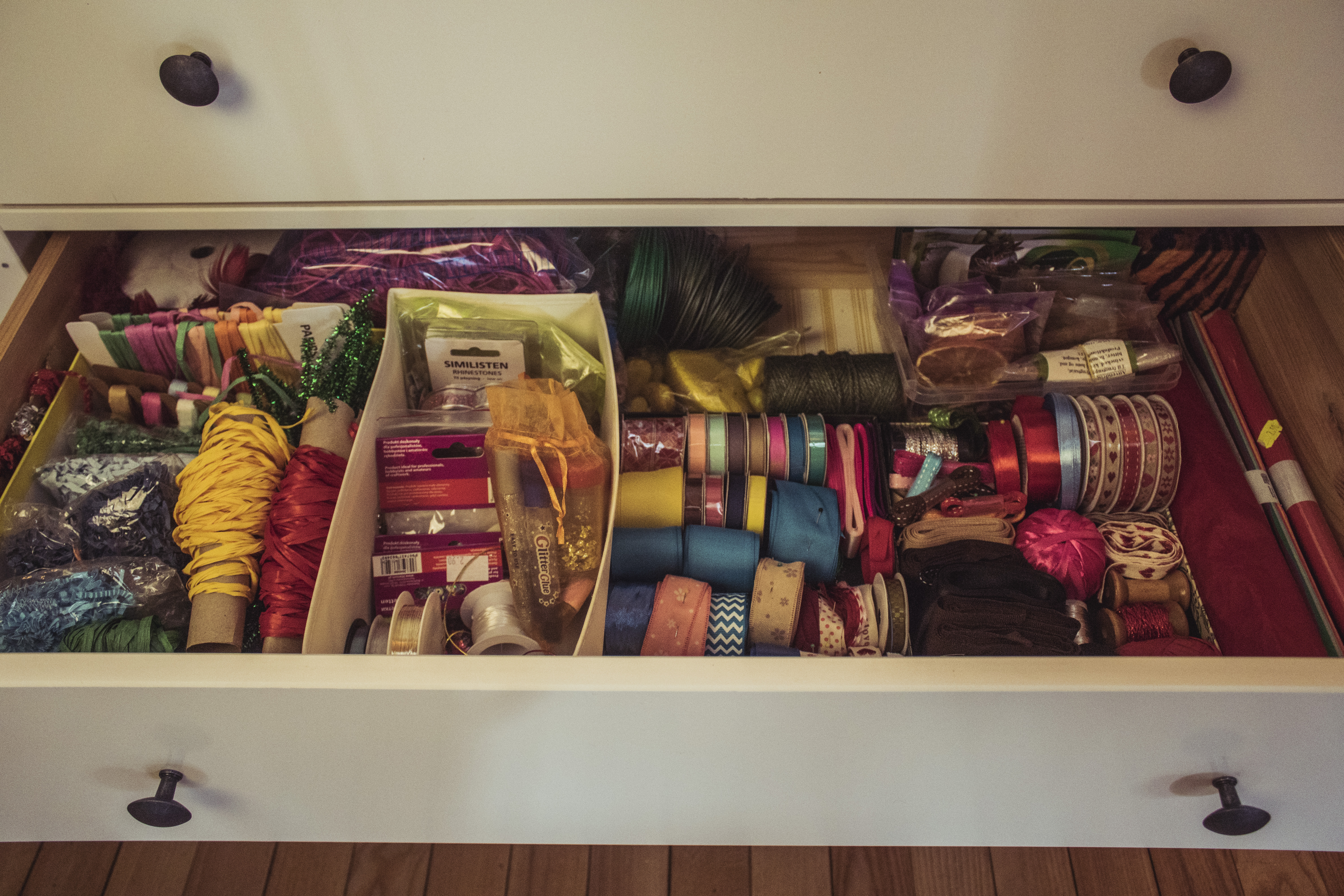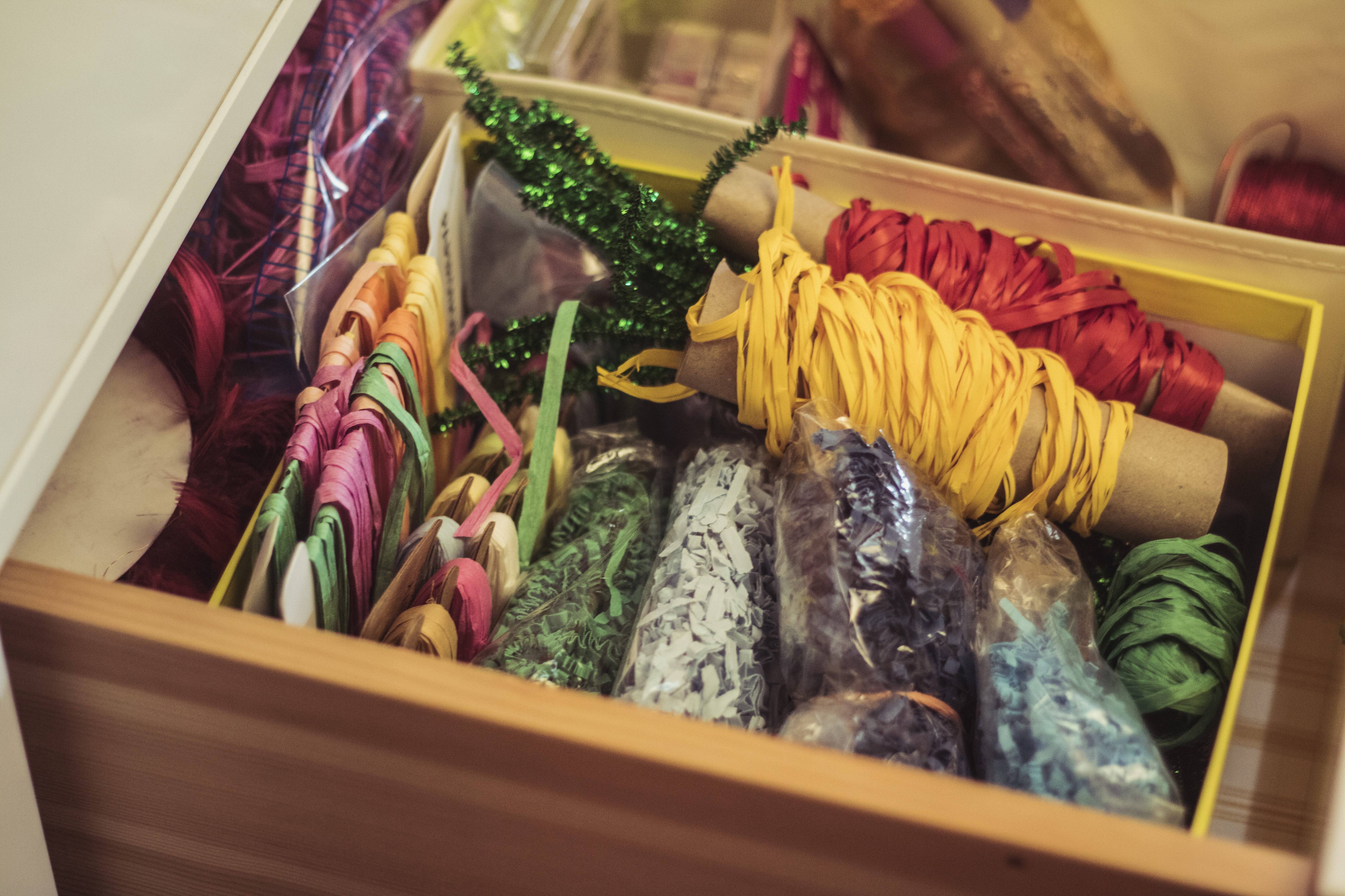 Przedostatnia szuflada to królestwo wstążek, tasiemek, bibułek, drucików, koralików, piórek, bibiułek – wszystkiego, co się może przydać do projektów DYI. Jak widzicie, wstążki są pięknie zwinięte i zamocowane szpilką z łebkiem, a potem poukładane w wieczku pudełka od butów. Piórka i inne drobiazgi wkładam do torebek strunowych, a koraliki do woreczków na biżuterię.