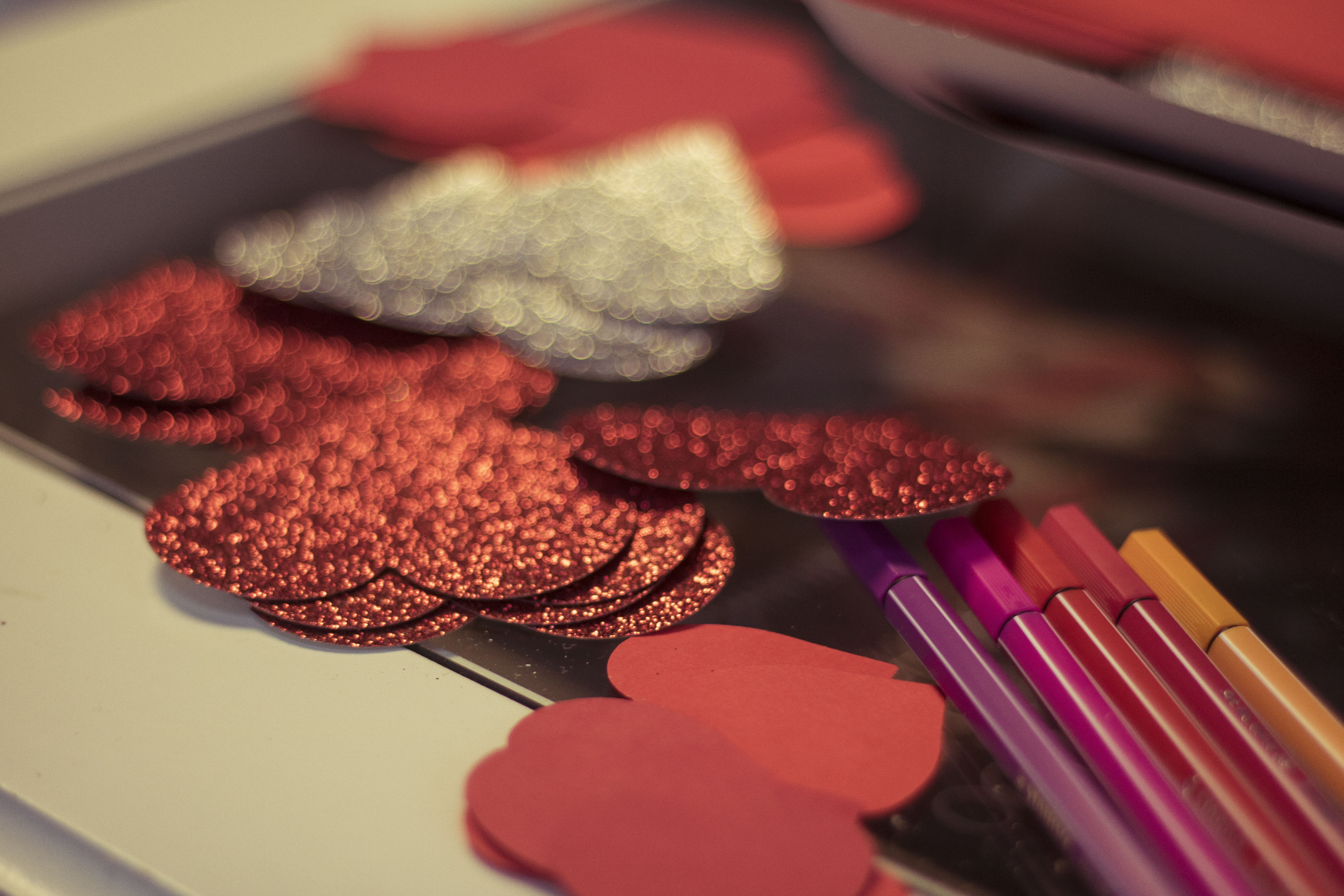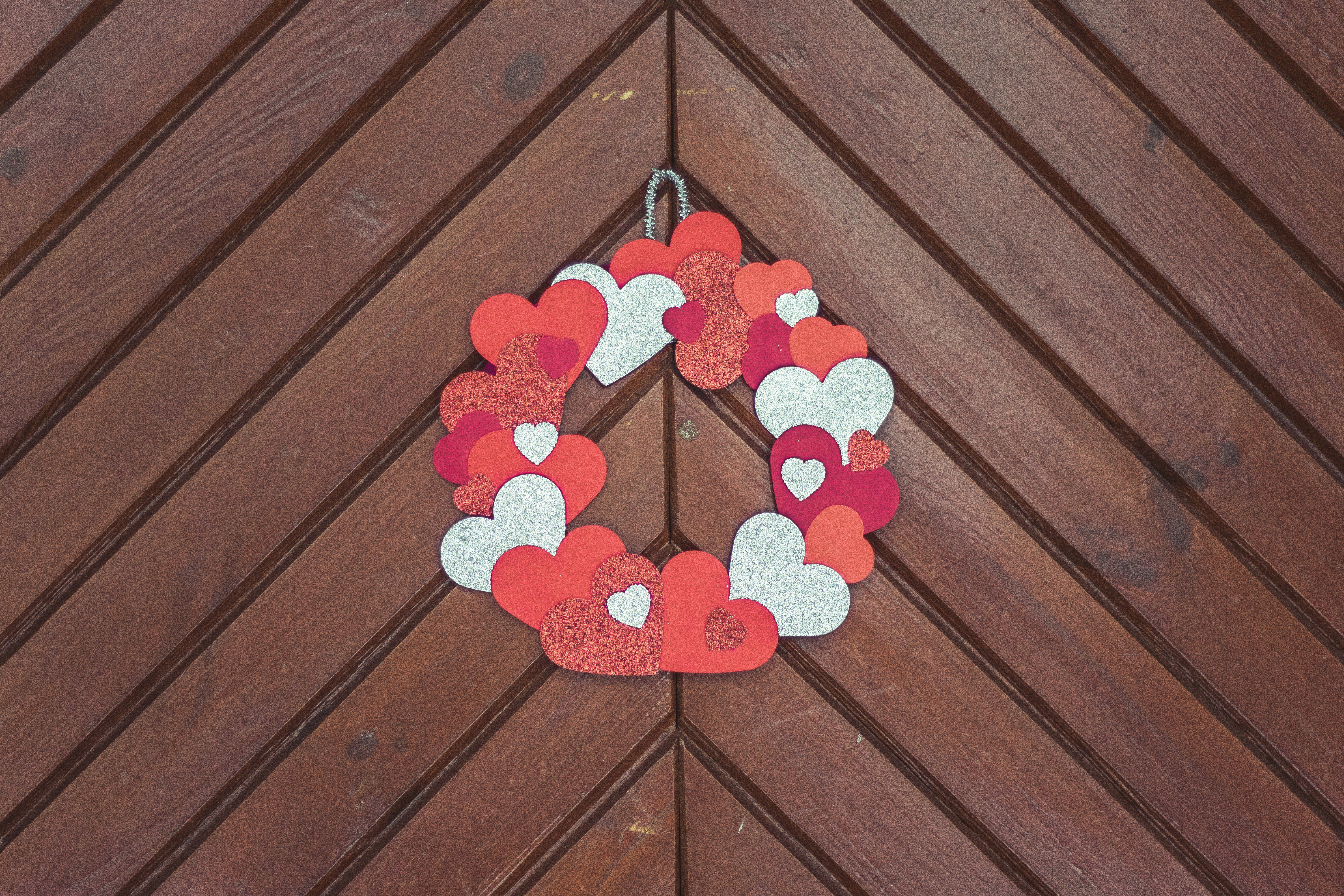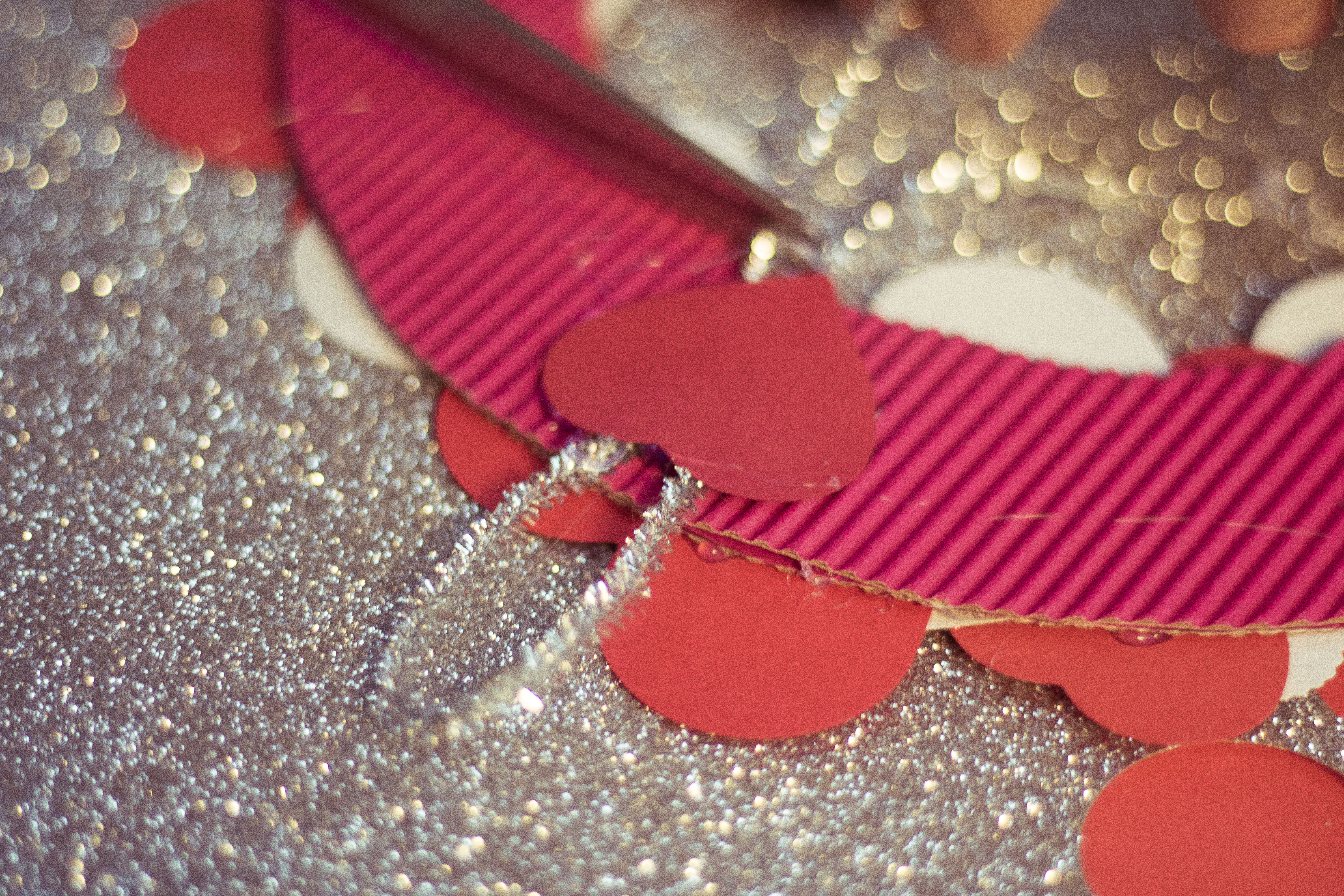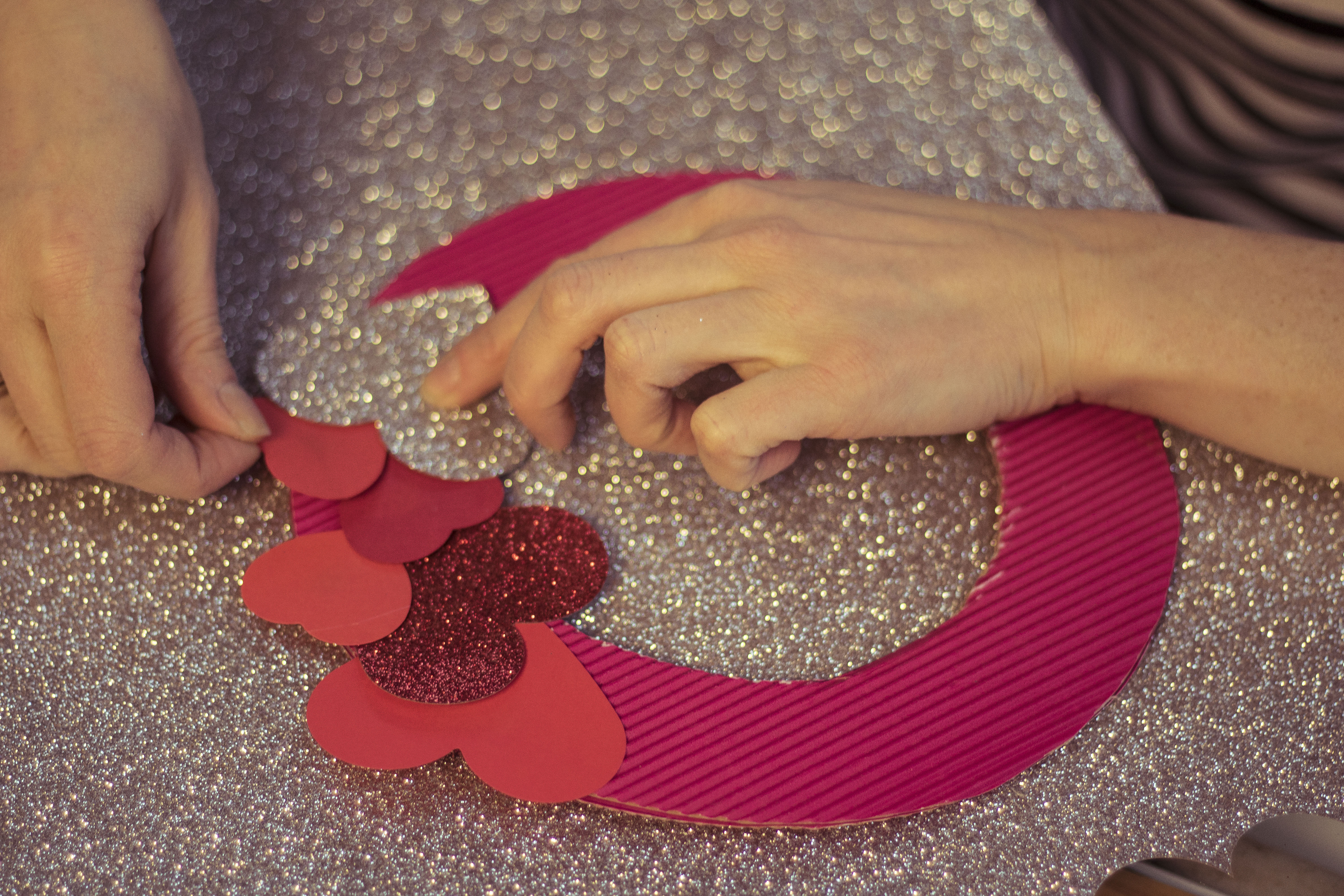 Już od wejścia możecie zasygnalizować ukochanej osobie, że coś wyjątkowego czeka w środku… Przygotowanie wieńca z papierowych serduszek zajmie dosłownie parę chwil, a wrażenie będzie znakomite! Jako podłoża użyjemy koła wyciętego z kartonu  – trzeba odrysować na nim dwa kółka – większe i mniejsze i wyciąć w miarę starannie. Jeśli karton jest za cienki możecie skleić ze sobą dwie warstwy. Na taką bazę bedziemy teraz naklejać serca wycięte z kartonu – ja do zwykłej czerwieni dołożyłam brokat i srebrny brokat, żeby trochę ożywić kompozycję. Zacznijcie od dołu symetrycznie mocując dwa serduszka, a potem już jak Was fantazja poniesie. Pamiętajcie jednak, by nakładać serca na siebie tak, żeby zakryć bazę. Na koniec przyklejcie mocowanie (może być nawet ze zwykłej nitki) i gotowe!