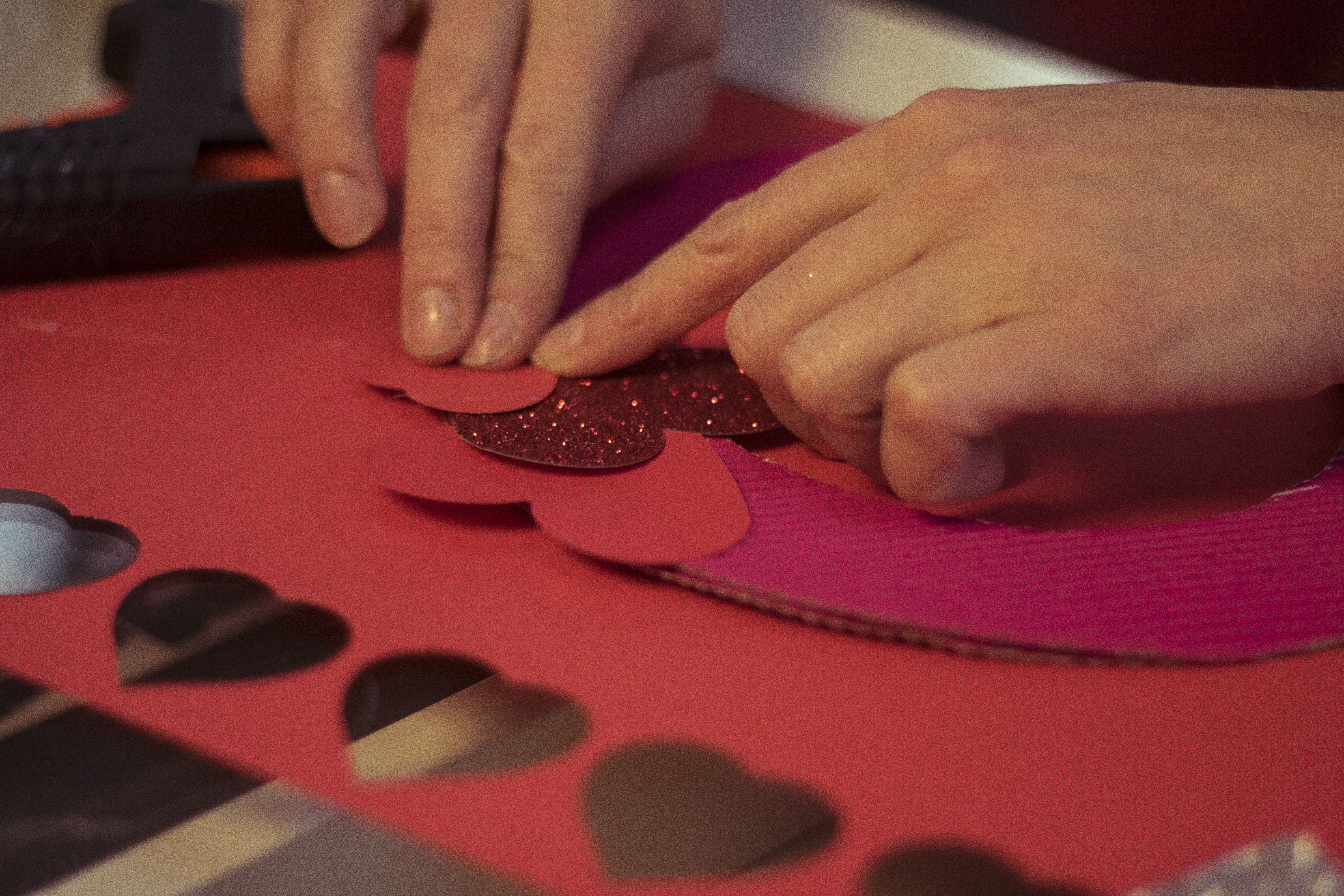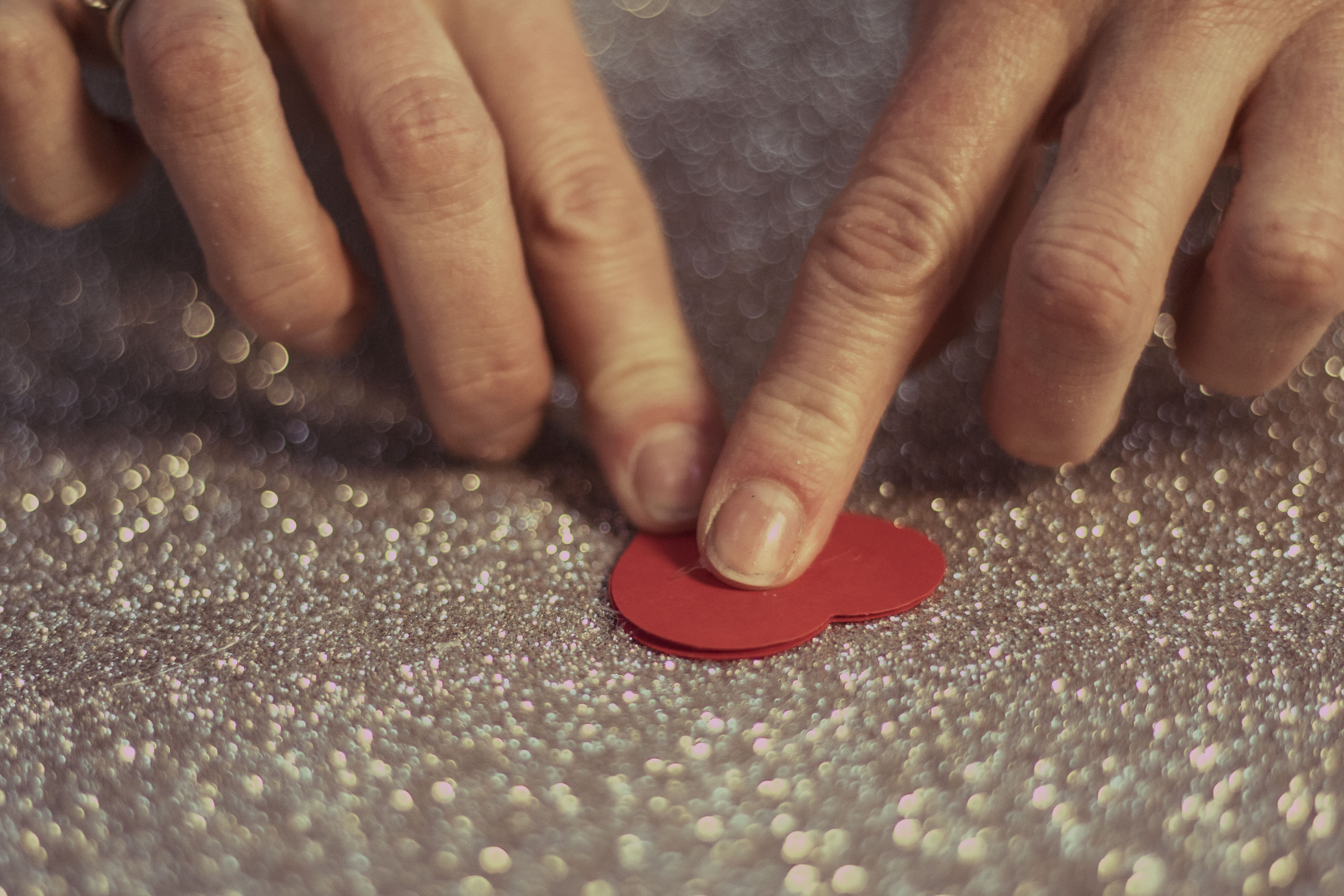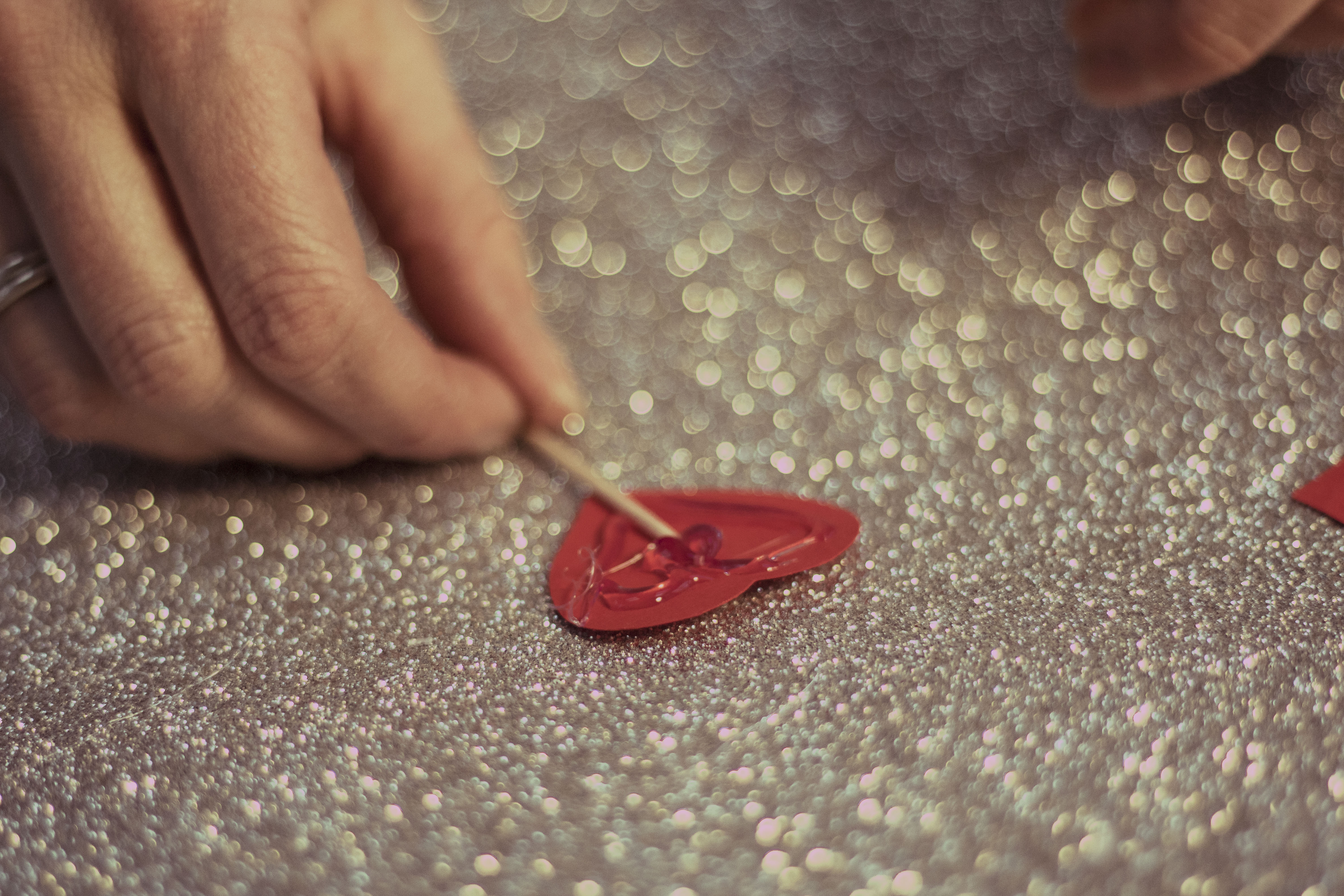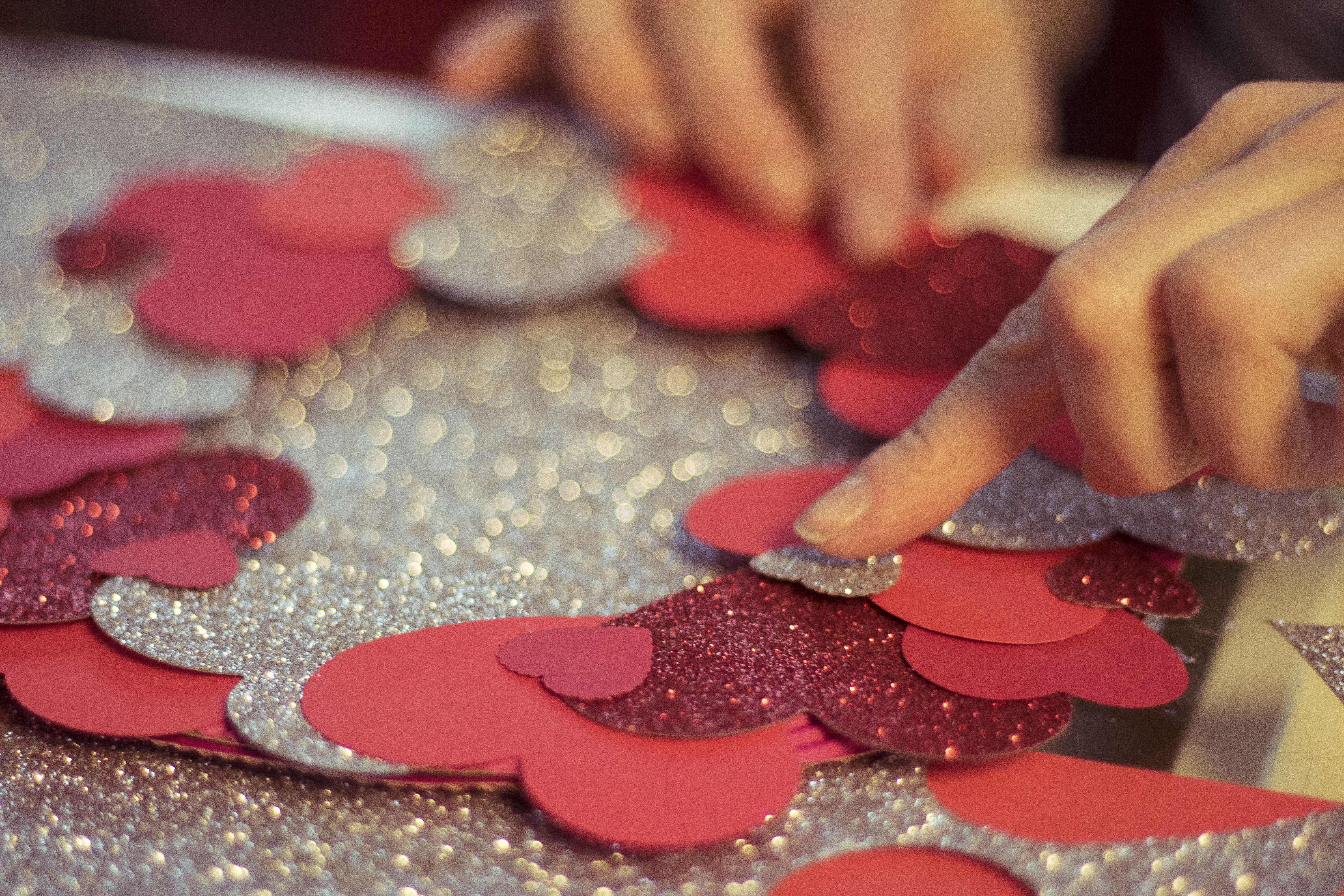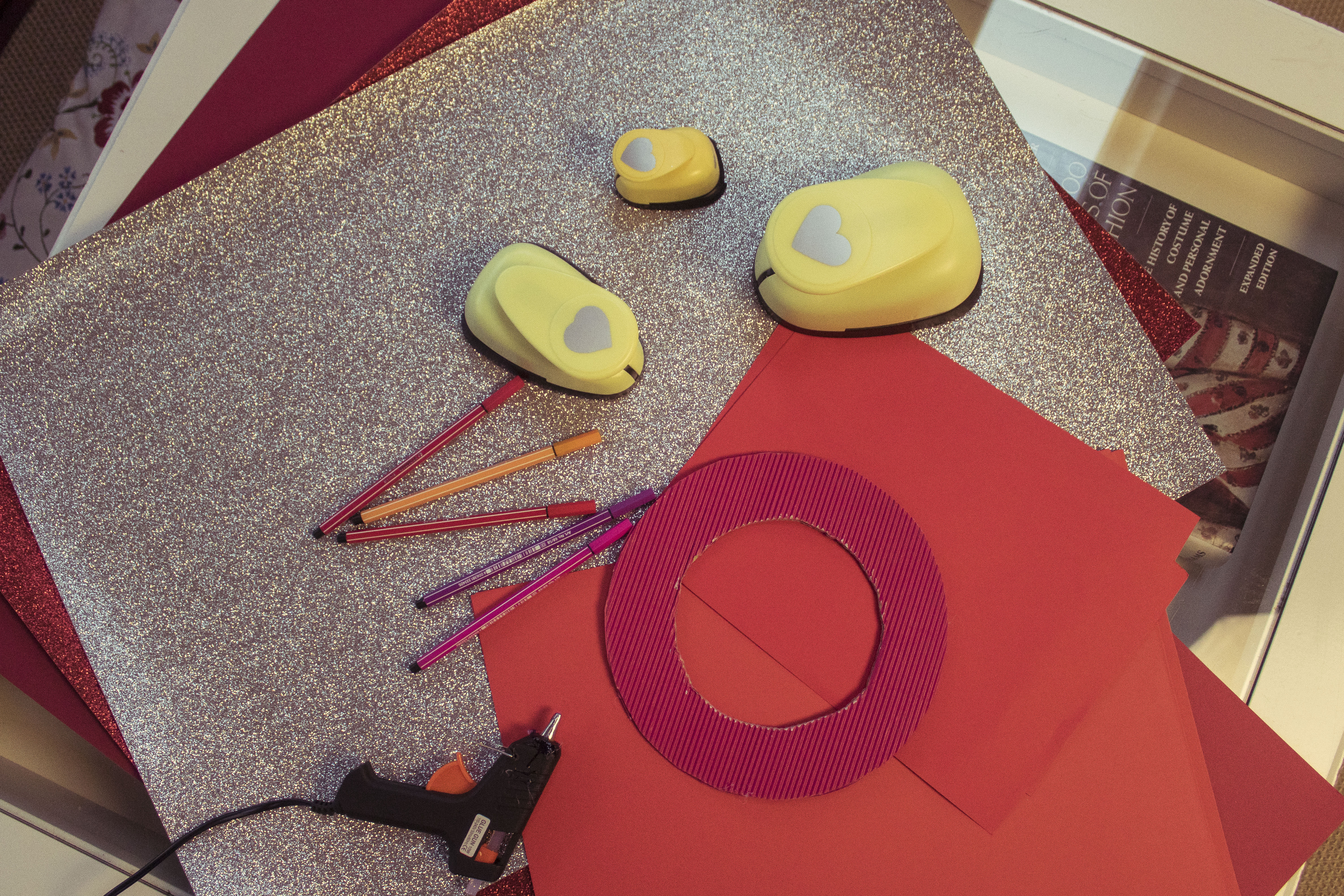 Już od wejścia możecie zasygnalizować ukochanej osobie, że coś wyjątkowego czeka w środku… Przygotowanie wieńca z papierowych serduszek zajmie dosłownie parę chwil, a wrażenie będzie znakomite! Jako podłoża użyjemy koła wyciętego z kartonu  – trzeba odrysować na nim dwa kółka – większe i mniejsze i wyciąć w miarę starannie. Jeśli karton jest za cienki możecie skleić ze sobą dwie warstwy. Na taką bazę bedziemy teraz naklejać serca wycięte z kartonu – ja do zwykłej czerwieni dołożyłam brokat i srebrny brokat, żeby trochę ożywić kompozycję. Zacznijcie od dołu symetrycznie mocując dwa serduszka, a potem już jak Was fantazja poniesie. Pamiętajcie jednak, by nakładać serca na siebie tak, żeby zakryć bazę. Na koniec przyklejcie mocowanie (może być nawet ze zwykłej nitki) i gotowe!