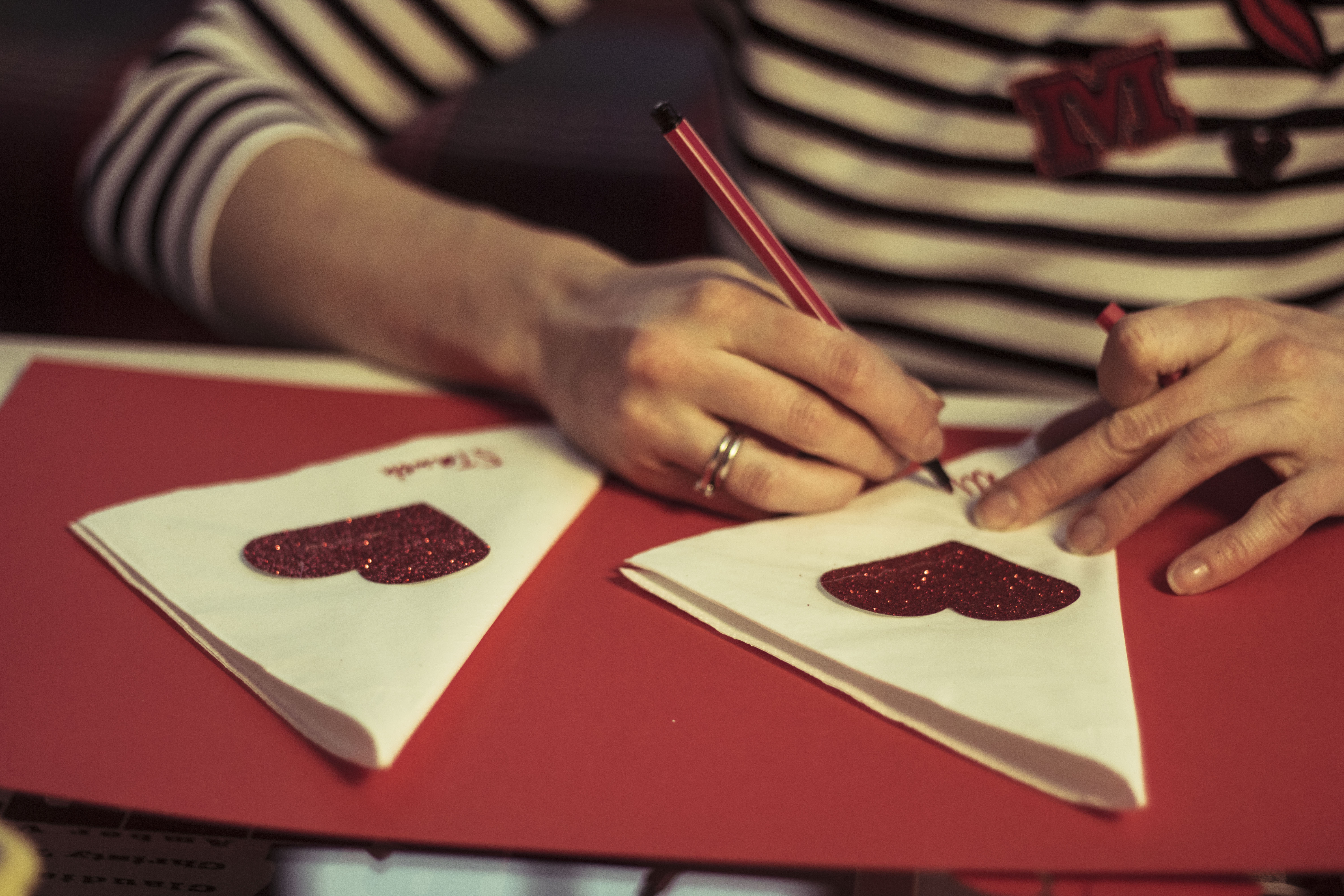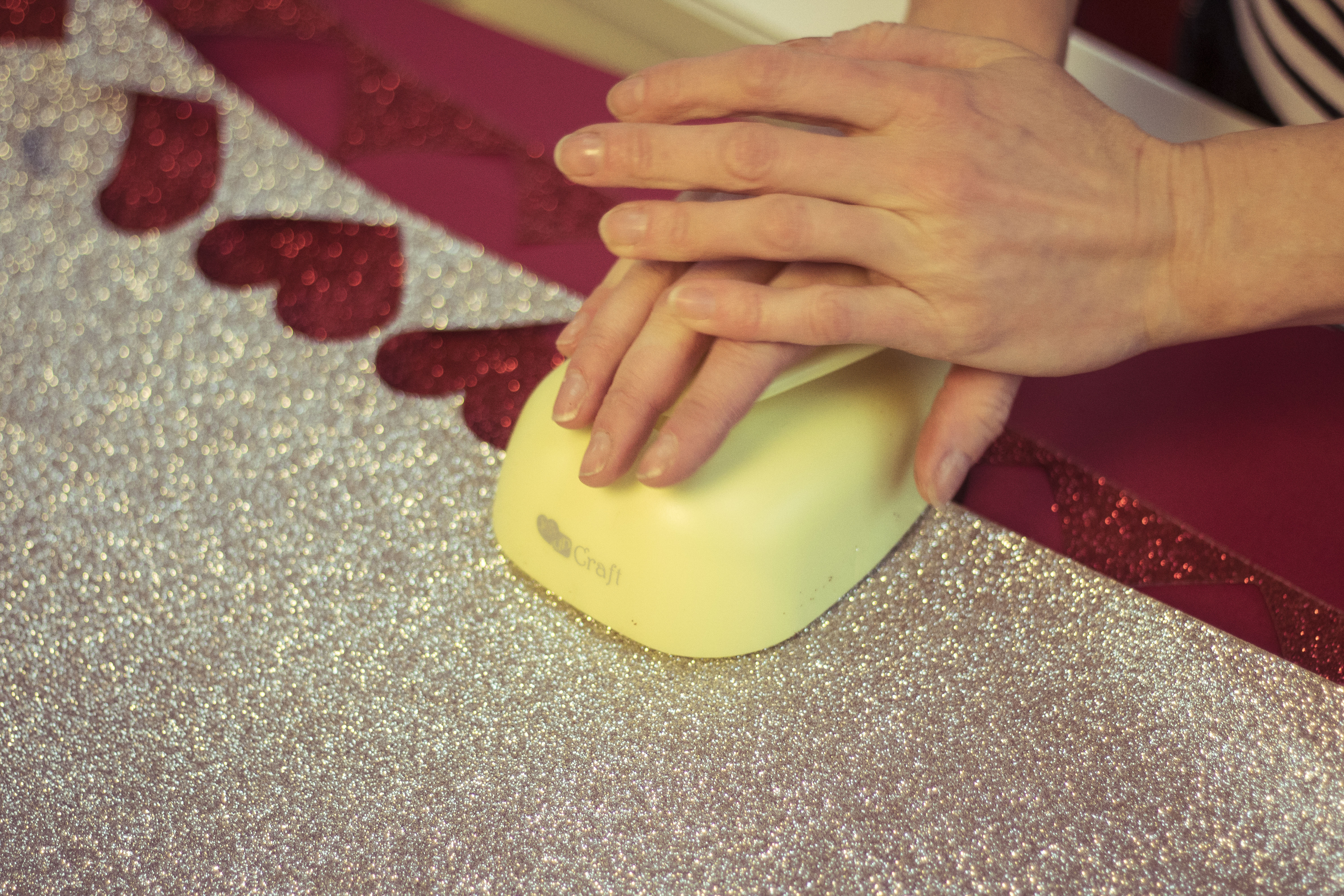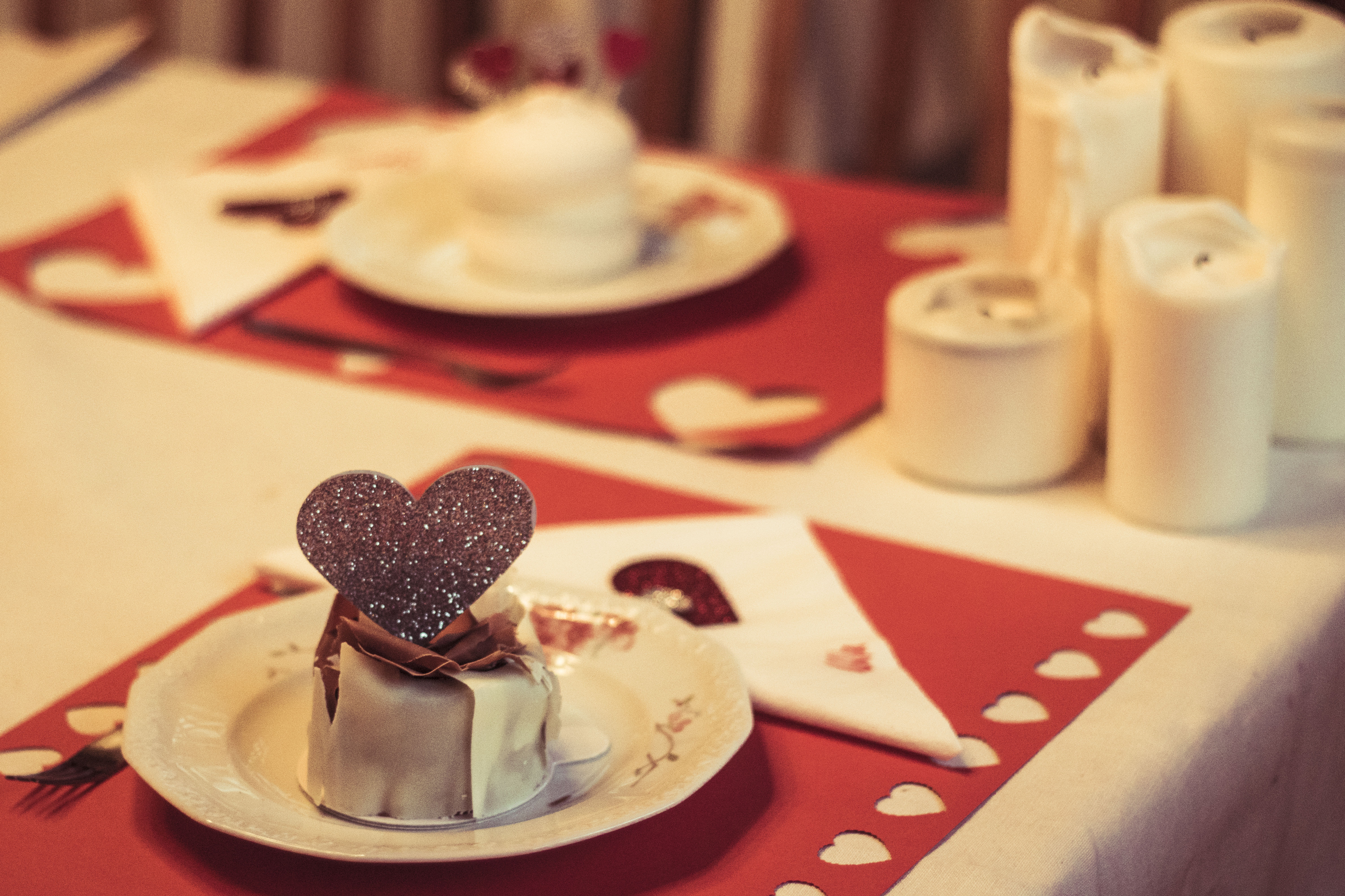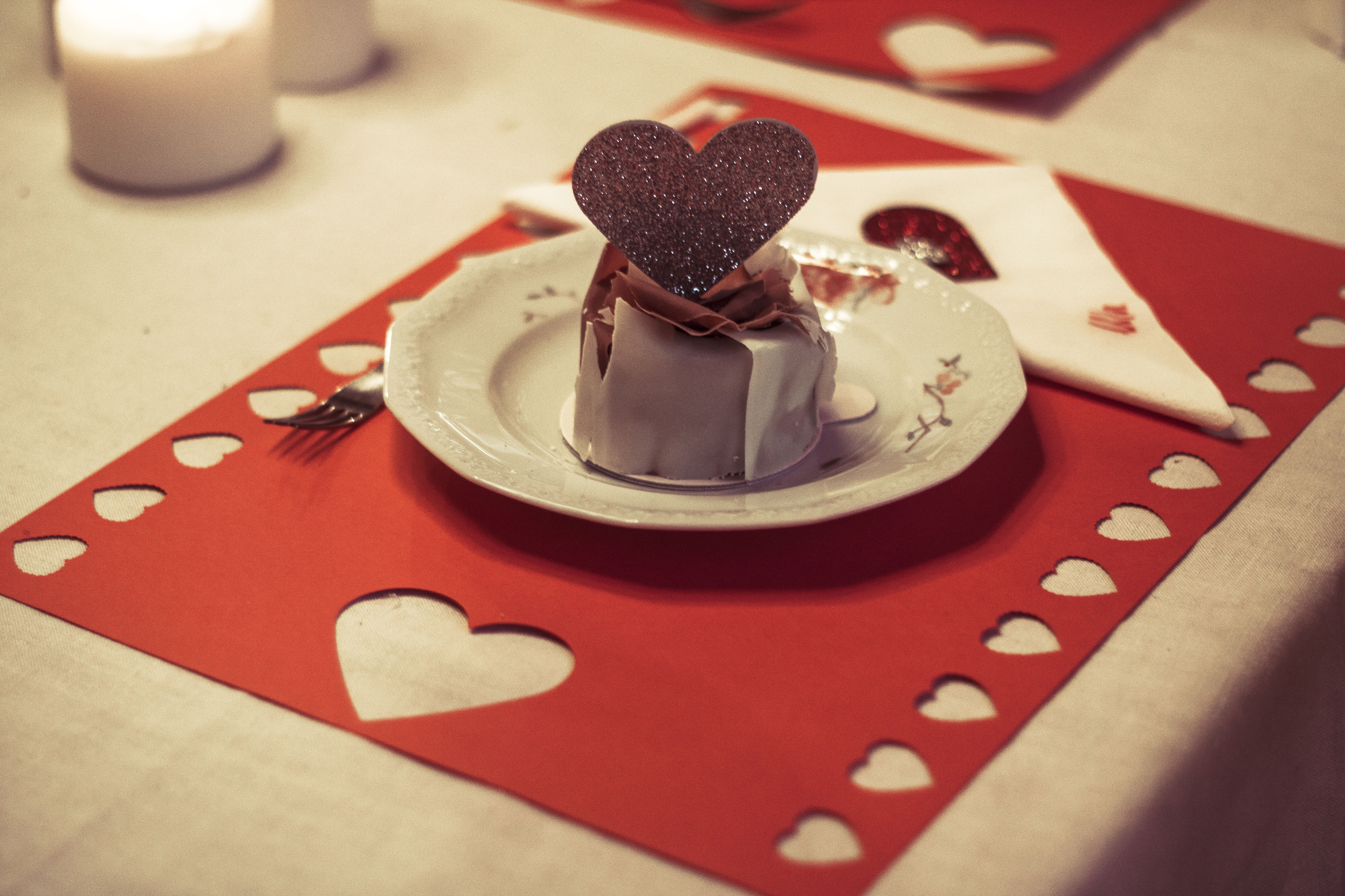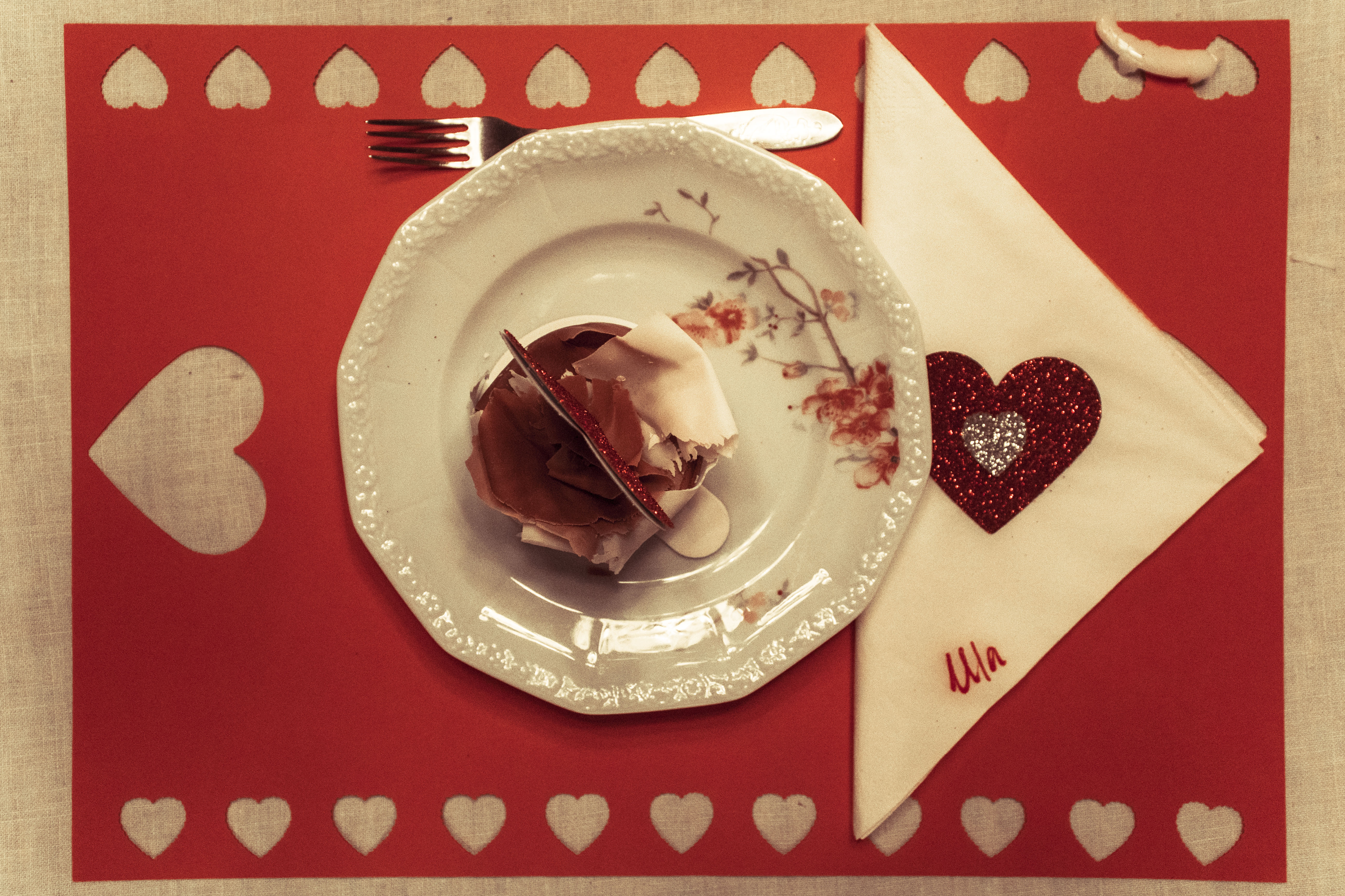 Zwykły arkusz czerwonego papieru w formacie A3 może służyć za podkładkę pod nakrycie na stół. Żeby było walentynkowe wystarczy powycinać w nim ornamenty za pomocą wykrawacza (który kupicie m.in w Empiku) – każda podkładka może mieć niepowtarzalny wzór, możecie wyciąć jedno albo wiele kółek, a jeśli nie macie wykrawacza możecie śmiało wyciąć nożyczkami pół serduszka z brzegu.