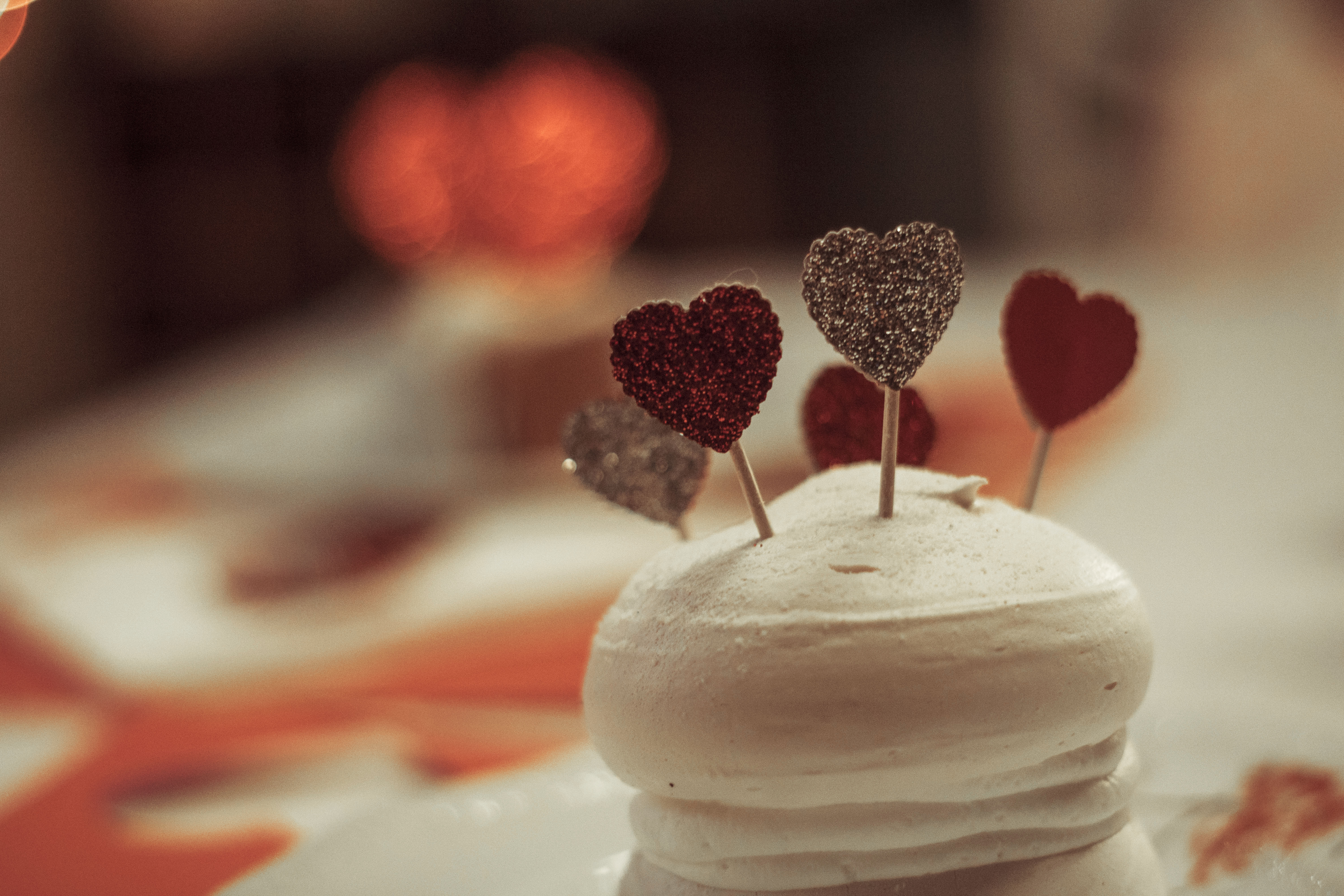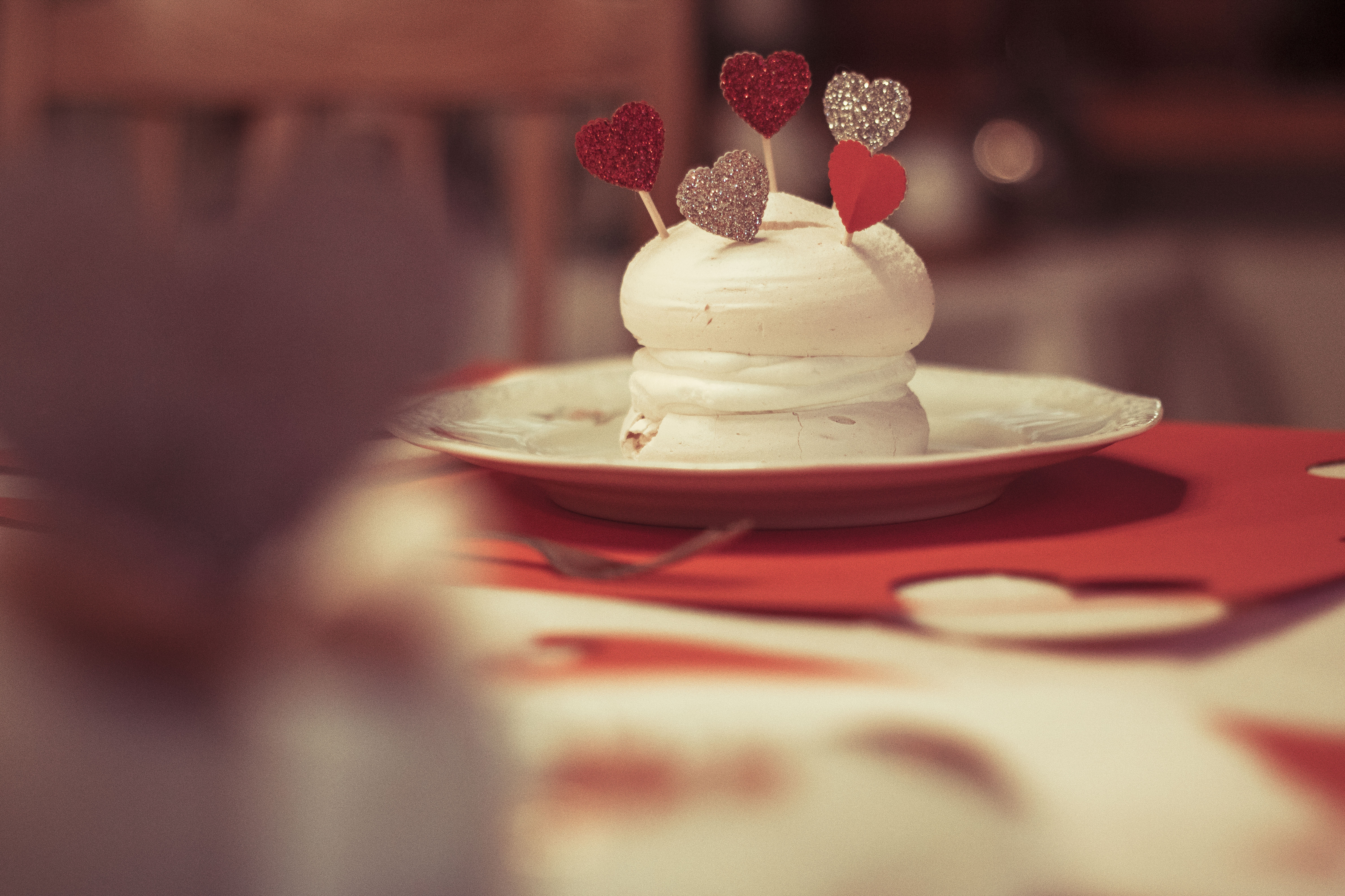 Walentynkowo można udekorować także potrawy, a jeszcze lepiej desery. Do tego celu będą Wam potrzebne serduszka z kartonu (możecie użyć tych, które zostały Wam po wycinaniu podkładek), wykałaczki i klej w pistolecie. Serduszka sklejacie po 2 sztuki razem w środku umieszczając jeden koniec wykałaczki, tak, by nie wystawał. Tak przygotowane wykałaczki wystarczy wbić teraz w porcję przygotowaną do podania.