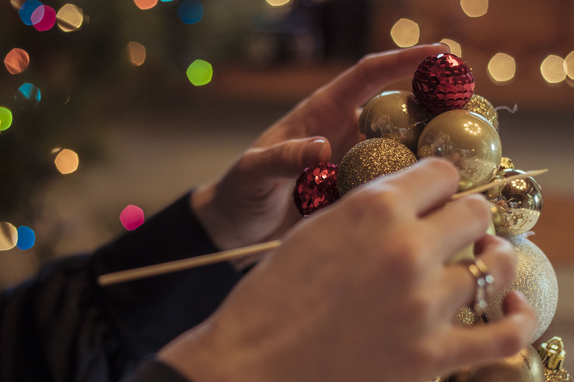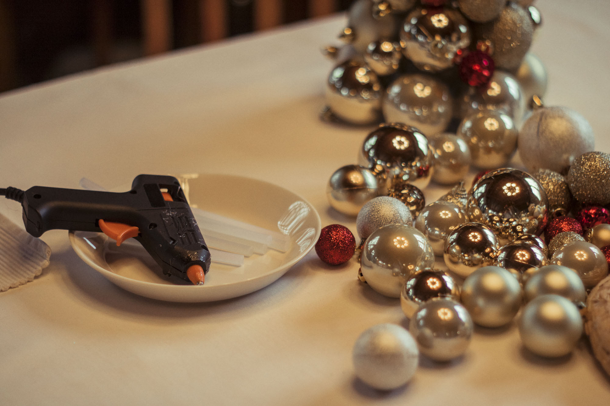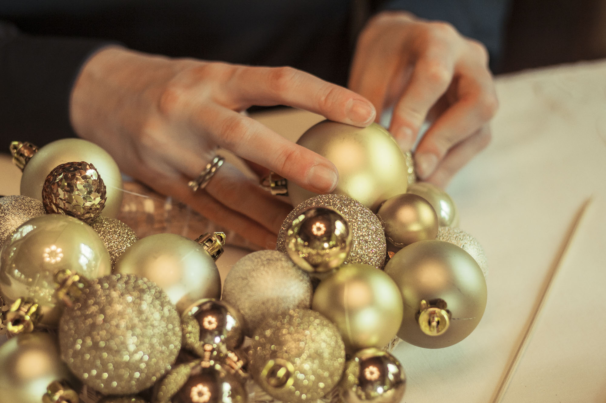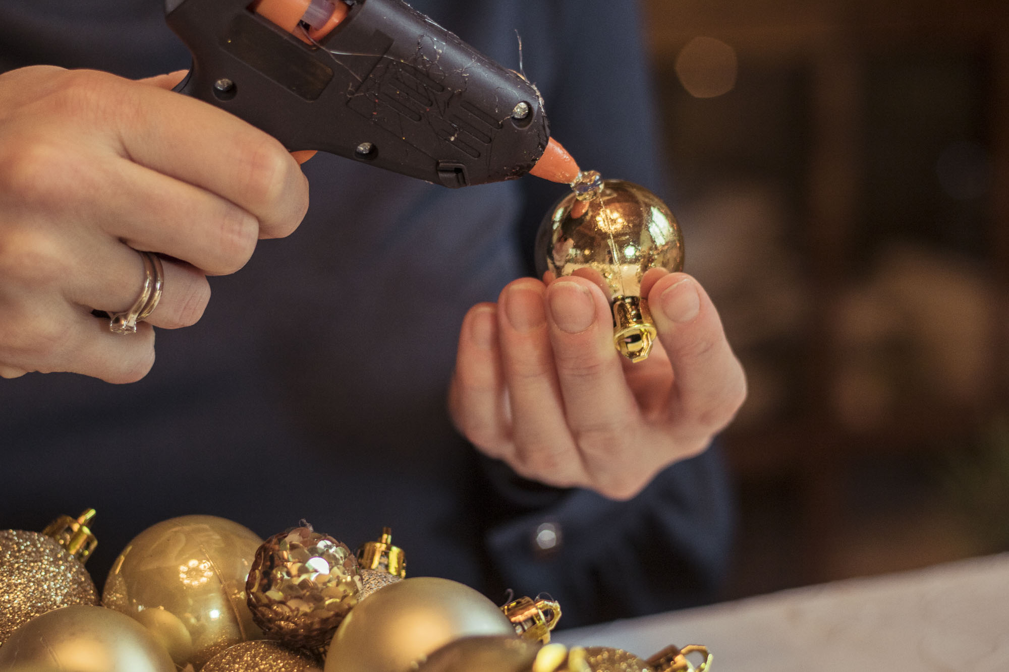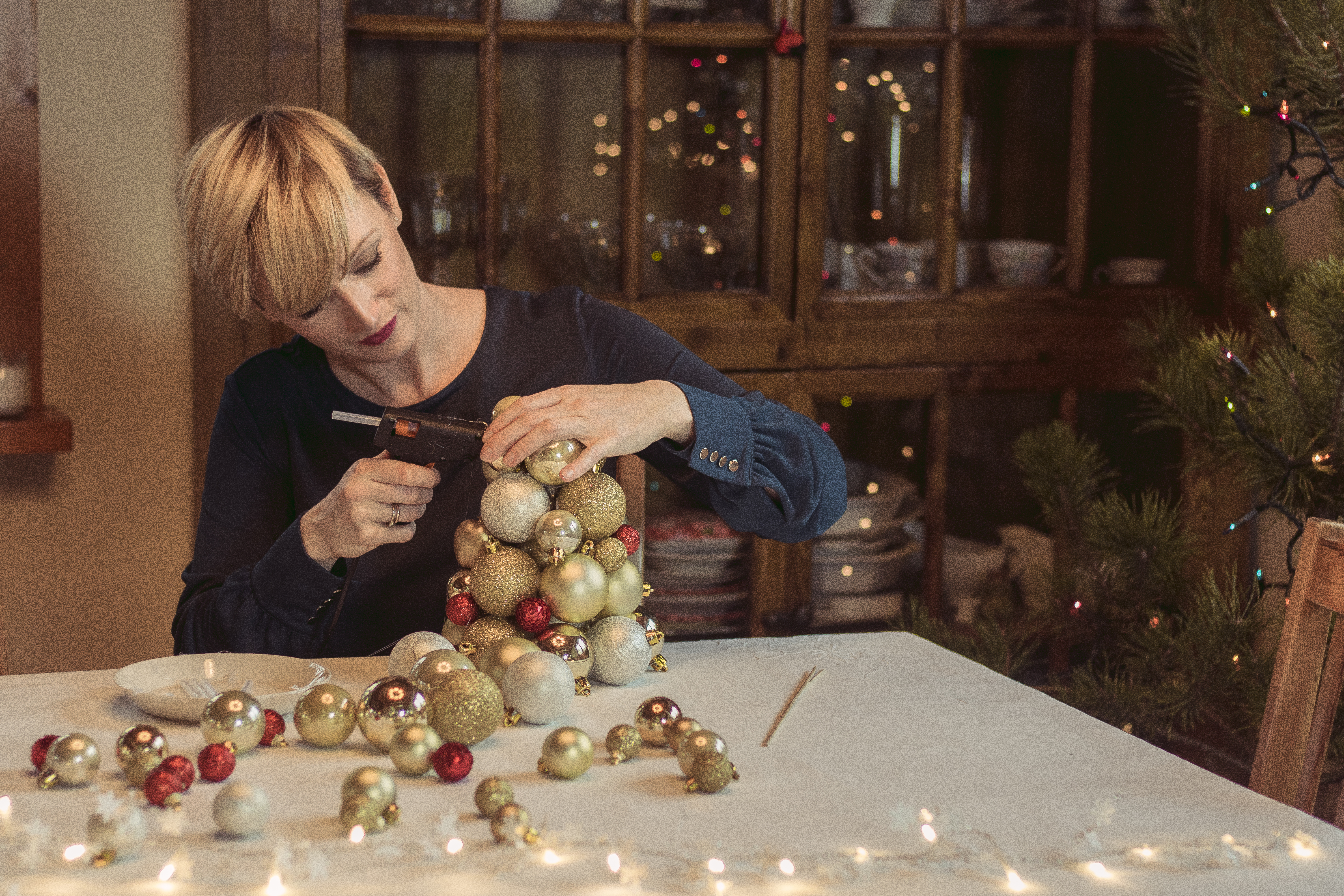 Najłatwiej stworzyć piękny wieniec wykorzystując bombki w co najmniej 3 rozmiarach. Zamocujcie na początek jedną, dużą bombkę dość centralnie, a potem zapełniajcie stopniowo przestrzeń wokół niej dokładając mniejsze i większe bombki. Im gęściej tym lepiej. Pamiętajcie także o wypełnieniu przestrzeni od wewnętrznej strony wieńca, bo tam najbardziej będzie widać braki. Mocując bombki na klej w pistolecie przyklejajcie je nie tylko do podłoża, ale i do siebie nawzajem, dzięki temu konstrukcja będzie solidna. Co więcej – zwłaszcza przy małych wieńcach będą bombki, które wcale nie będą dotykały podstawy.