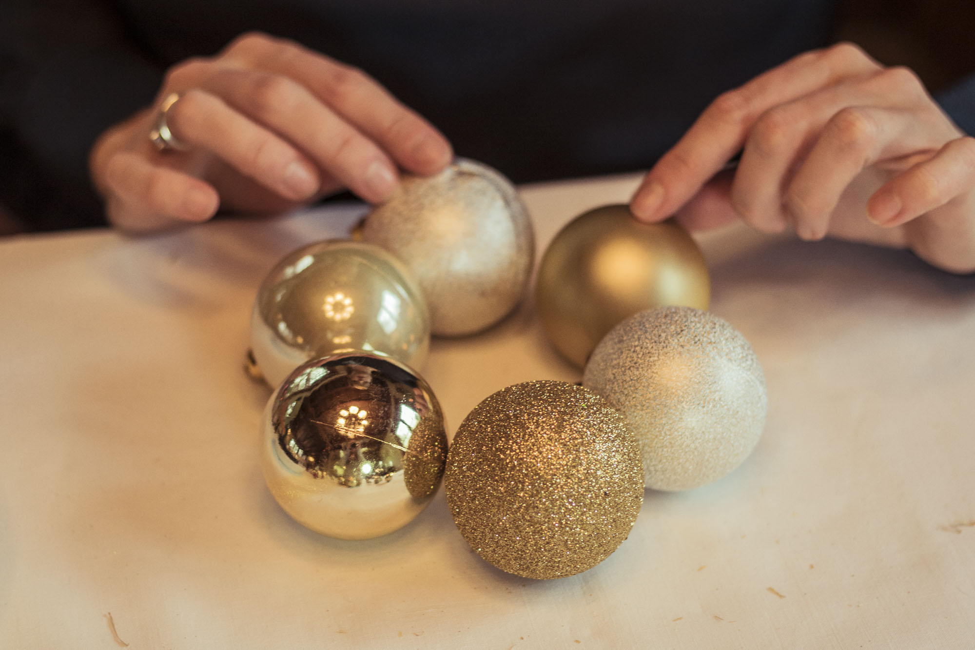 I teraz są dwie szkoły: jedna mówi, że powinno się eksponować wyłącznie okrągłą część bombki, czyli, że należy zdjąć mocowanie na sznurek i przyklejać tak, by dziubek bombki był skierowany do dołu i niewidoczny. Druga szkoła z kolei (którą jak widzicie wyznaję) twierdzi, że nie trzeba wcale ukrywać, że to bombka, a złote czy srebrne „ogonki” mogą być dekoracyjne. Zróbcie tak, jak się Wam podoba.